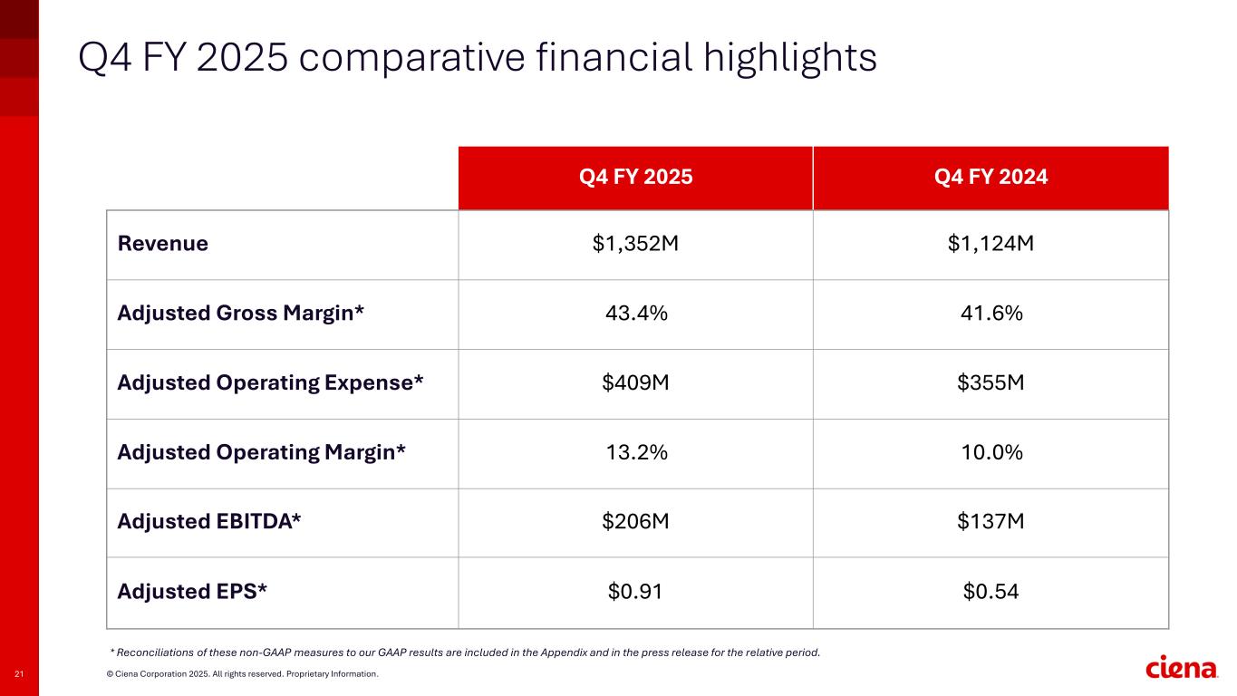 20 © Ciena Corporation 2025. All rights reserved. Proprietary Information. Q4 FY 2025 key highlights ▪ Non-telco represented 55% of total revenue ▪ Direct Cloud Provider revenue grew 49% YoY and represented 42% of total revenue ▪ EMEA revenue grew 30% YoY ▪ Global Services revenue grew 25% YoY • WL6e deployments continue to ramp driven by AI network buildouts with 12 new customers in the quarter, including a new neoscaler logo in the top 3 • Record quarter in RLS revenue and shipments, driven by hyperscaler AI infrastructure buildouts • Second consecutive record quarter for coherent pluggables, for both shipments and revenue • Ciena’s DCOM Solution is now operational in Meta Data Centers • Unveiled the 5131-CAP, Coherent Access Platform, allowing Service Providers and Cable MSOs to extend fiber connectivity to remote areas in a more efficient and cost- effective manner. • WaveRouter's footprint continues to expand with a new International Tier-1 provider, delivering IP connectivity in both terrestrial and submarine applications • Total shareholder return five-year CAGR of 35%1 • Repurchased ~0.7 million shares for $84.5 million under our three-year program (FY25-27) 1 Based on closing share price between 11/18/2020 to 11/18/2025 Achieving broad-based growth Prioritizing long term shareholder valueDriving the pace of innovation