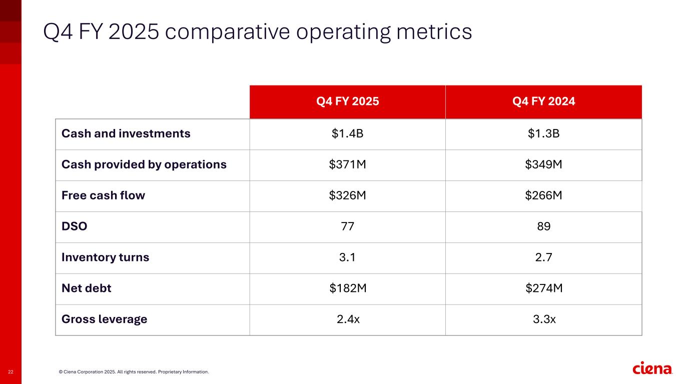 21 © Ciena Corporation 2025. All rights reserved. Proprietary Information. Q4 FY 2025 comparative financial highlights * Reconciliations of these non-GAAP measures to our GAAP results are included in the Appendix and in the press release for the relative period. Q4 FY 2025 Q4 FY 2024 Revenue $1,352M $1,124M Adjusted Gross Margin* 43.4% 41.6% Adjusted Operating Expense* $409M $355M Adjusted Operating Margin* 13.2% 10.0% Adjusted EBITDA* $206M $137M Adjusted EPS* $0.91 $0.54