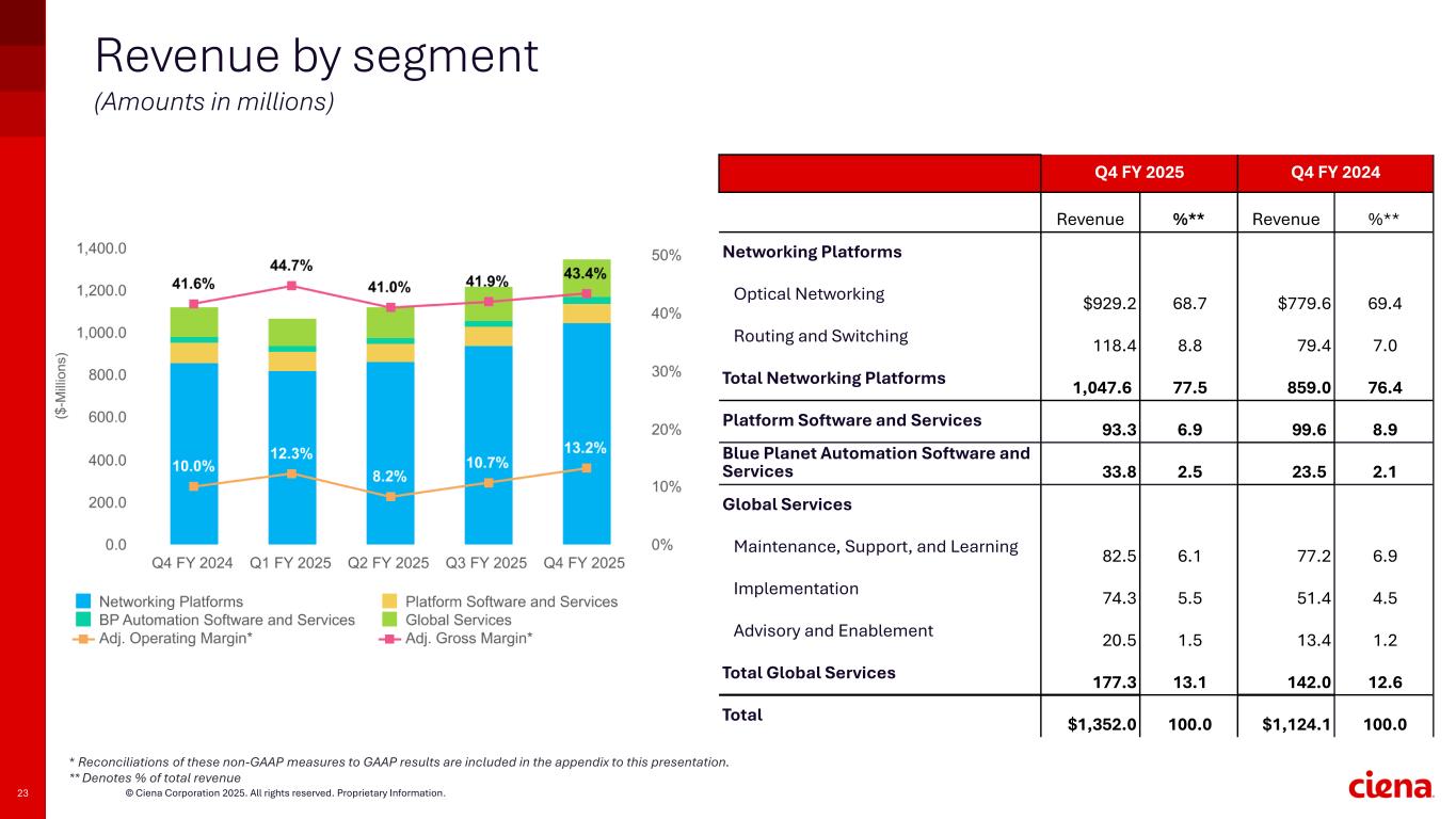 23 © Ciena Corporation 2025. All rights reserved. Proprietary Information. Revenue by segment (Amounts in millions) Q4 FY 2025 Q4 FY 2024 Revenue %** Revenue %** Networking Platforms Optical Networking $929.2 68.7 $779.6 69.4 Routing and Switching 118.4 8.8 79.4 7.0 Total Networking Platforms 1,047.6 77.5 859.0 76.4 Platform Software and Services 93.3 6.9 99.6 8.9 Blue Planet Automation Software and Services 33.8 2.5 23.5 2.1 Global Services Maintenance, Support, and Learning 82.5 6.1 77.2 6.9 Implementation 74.3 5.5 51.4 4.5 Advisory and Enablement 20.5 1.5 13.4 1.2 Total Global Services 177.3 13.1 142.0 12.6 Total $1,352.0 100.0 $1,124.1 100.0 * Reconciliations of these non-GAAP measures to GAAP results are included in the appendix to this presentation. ** Denotes % of total revenue