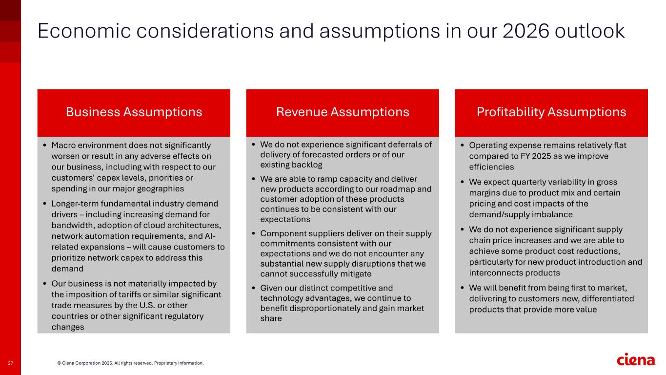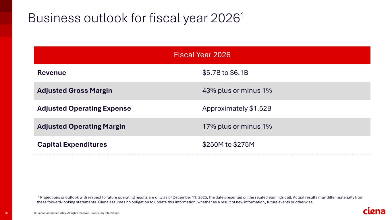 27 © Ciena Corporation 2025. All rights reserved. Proprietary Information. Economic considerations and assumptions in our 2026 outlook • We do not experience significant deferrals of delivery of forecasted orders or of our existing backlog • We are able to ramp capacity and deliver new products according to our roadmap and customer adoption of these products continues to be consistent with our expectations • Component suppliers deliver on their supply commitments consistent with our expectations and we do not encounter any substantial new supply disruptions that we cannot successfully mitigate • Given our distinct competitive and technology advantages, we continue to benefit disproportionately and gain market share Revenue AssumptionsBusiness Assumptions Profitability Assumptions • Operating expense remains relatively flat compared to FY 2025 as we improve efficiencies • We expect quarterly variability in gross margins due to product mix and certain pricing and cost impacts of the demand/supply imbalance • We do not experience significant supply chain price increases and we are able to achieve some product cost reductions, particularly for new product introduction and interconnects products • We will benefit from being first to market, delivering to customers new, differentiated products that provide more value • Macro environment does not significantly worsen or result in any adverse effects on our business, including with respect to our customers' capex levels, priorities or spending in our major geographies • Longer-term fundamental industry demand drivers – including increasing demand for bandwidth, adoption of cloud architectures, network automation requirements, and AI- related expansions – will cause customers to prioritize network capex to address this demand • Our business is not materially impacted by the imposition of tariffs or similar significant trade measures by the U.S. or other countries or other significant regulatory changes