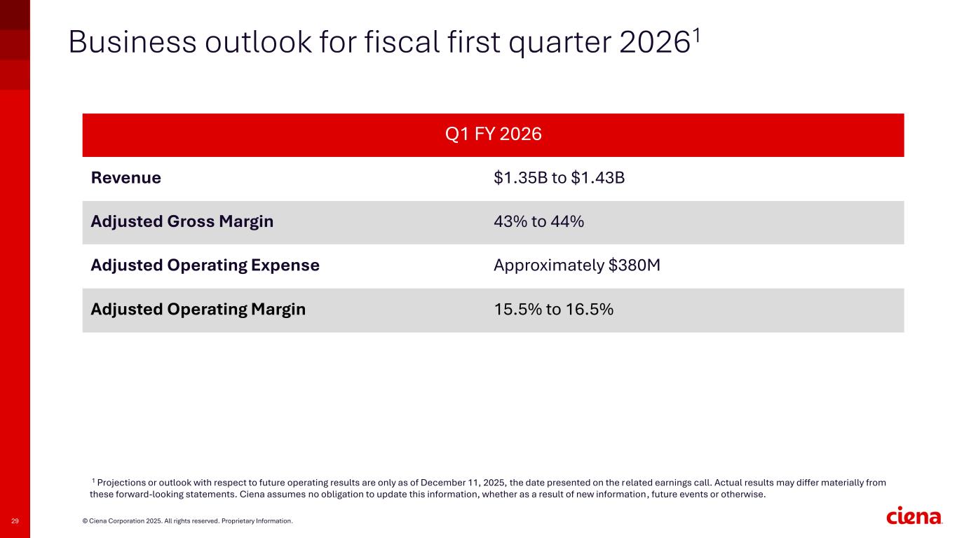 28 © Ciena Corporation 2025. All rights reserved. Proprietary Information. Business outlook for fiscal year 20261 1 Projections or outlook with respect to future operating results are only as of December 11, 2025, the date presented on the related earnings call. Actual results may differ materially from these forward-looking statements. Ciena assumes no obligation to update this information, whether as a result of new information, future events or otherwise. Fiscal Year 2026 Revenue $5.7B to $6.1B Adjusted Gross Margin 43% plus or minus 1% Adjusted Operating Expense Approximately $1.52B Adjusted Operating Margin 17% plus or minus 1% Capital Expenditures $250M to $275M