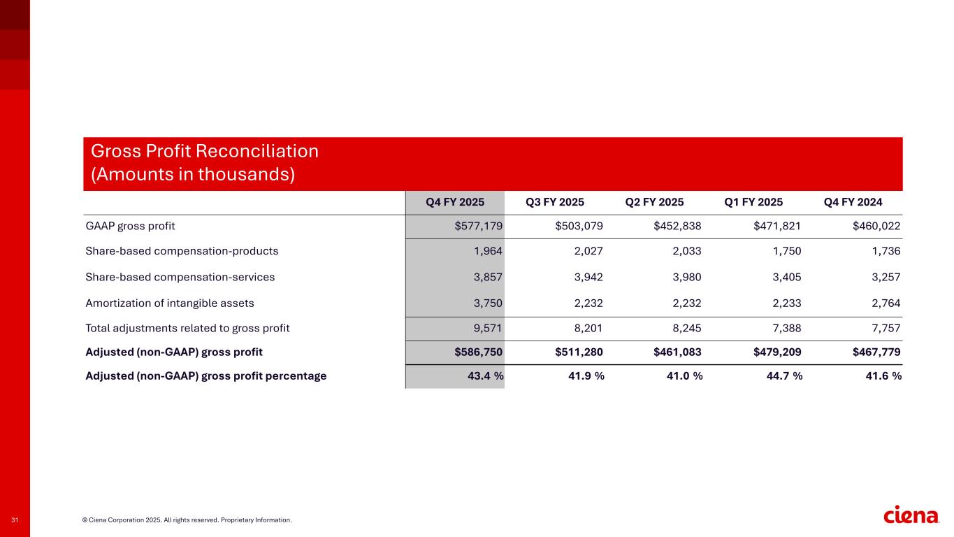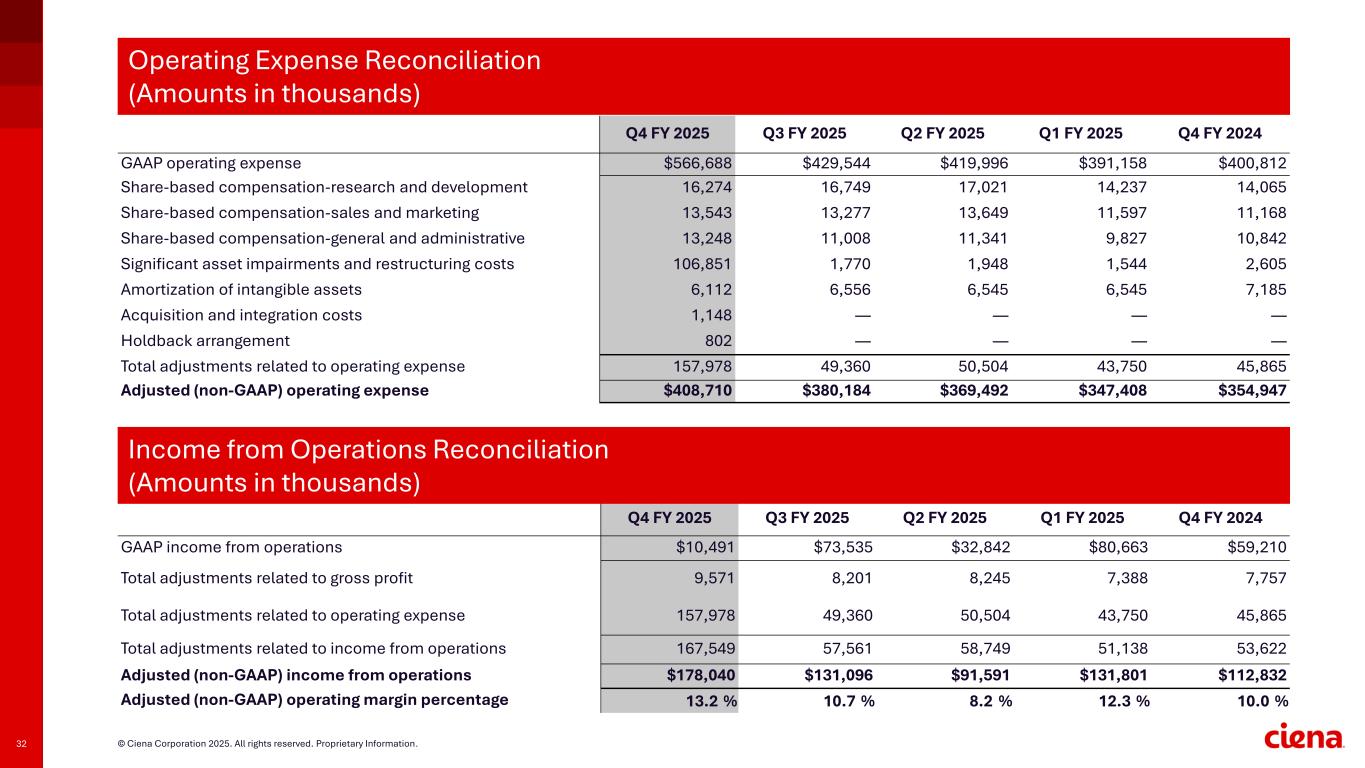 31 © Ciena Corporation 2025. All rights reserved. Proprietary Information. Q4 FY 2025 Q3 FY 2025 Q2 FY 2025 Q1 FY 2025 Q4 FY 2024 GAAP gross profit $577,179 $503,079 $452,838 $471,821 $460,022 Share-based compensation-products 1,964 2,027 2,033 1,750 1,736 Share-based compensation-services 3,857 3,942 3,980 3,405 3,257 Amortization of intangible assets 3,750 2,232 2,232 2,233 2,764 Total adjustments related to gross profit 9,571 8,201 8,245 7,388 7,757 Adjusted (non-GAAP) gross profit $586,750 $511,280 $461,083 $479,209 $467,779 Adjusted (non-GAAP) gross profit percentage 43.4 % 41.9 % 41.0 % 44.7 % 41.6 % Gross Profit Reconciliation (Amounts in thousands)