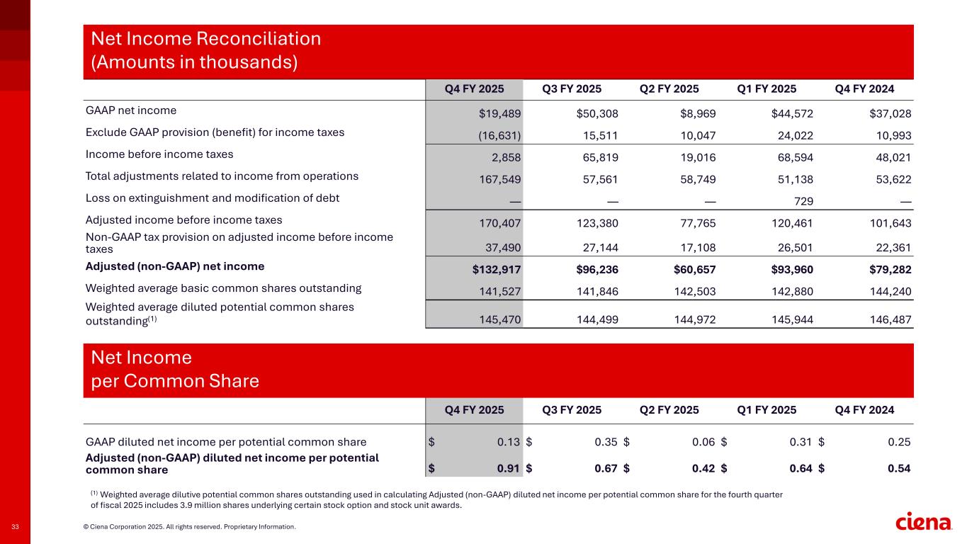 32 © Ciena Corporation 2025. All rights reserved. Proprietary Information. Q4 FY 2025 Q3 FY 2025 Q2 FY 2025 Q1 FY 2025 Q4 FY 2024 GAAP operating expense $566,688 $429,544 $419,996 $391,158 $400,812 Share-based compensation-research and development 16,274 16,749 17,021 14,237 14,065 Share-based compensation-sales and marketing 13,543 13,277 13,649 11,597 11,168 Share-based compensation-general and administrative 13,248 11,008 11,341 9,827 10,842 Significant asset impairments and restructuring costs 106,851 1,770 1,948 1,544 2,605 Amortization of intangible assets 6,112 6,556 6,545 6,545 7,185 Acquisition and integration costs 1,148 — — — — Holdback arrangement 802 — — — — Total adjustments related to operating expense 157,978 49,360 50,504 43,750 45,865 Adjusted (non-GAAP) operating expense $408,710 $380,184 $369,492 $347,408 $354,947 Q4 FY 2025 Q3 FY 2025 Q2 FY 2025 Q1 FY 2025 Q4 FY 2024 GAAP income from operations $10,491 $73,535 $32,842 $80,663 $59,210 Total adjustments related to gross profit 9,571 8,201 8,245 7,388 7,757 Total adjustments related to operating expense 157,978 49,360 50,504 43,750 45,865 Total adjustments related to income from operations 167,549 57,561 58,749 51,138 53,622 Adjusted (non-GAAP) income from operations $178,040 $131,096 $91,591 $131,801 $112,832 Adjusted (non-GAAP) operating margin percentage 13.2 % 10.7 % 8.2 % 12.3 % 10.0 % Operating Expense Reconciliation (Amounts in thousands) Income from Operations Reconciliation (Amounts in thousands)