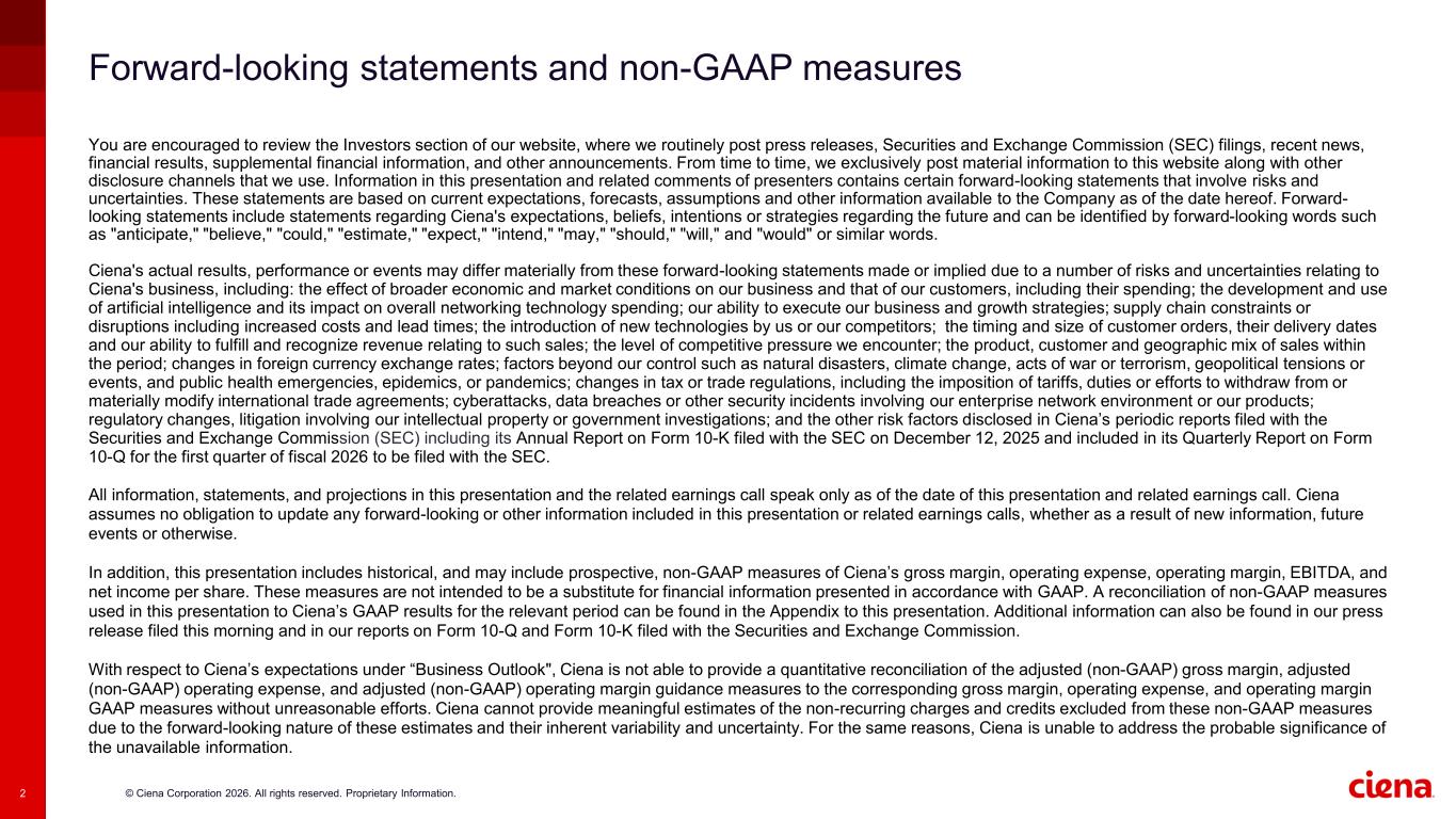 © Ciena Corporation 2026. All rights reserved. Proprietary Information.2 Forward-looking statements and non-GAAP measures You are encouraged to review the Investors section of our website, where we routinely post press releases, Securities and Exchange Commission (SEC) filings, recent news, financial results, supplemental financial information, and other announcements. From time to time, we exclusively post material information to this website along with other disclosure channels that we use. Information in this presentation and related comments of presenters contains certain forward-looking statements that involve risks and uncertainties. These statements are based on current expectations, forecasts, assumptions and other information available to the Company as of the date hereof. Forward- looking statements include statements regarding Ciena's expectations, beliefs, intentions or strategies regarding the future and can be identified by forward-looking words such as "anticipate," "believe," "could," "estimate," "expect," "intend," "may," "should," "will," and "would" or similar words. Ciena's actual results, performance or events may differ materially from these forward-looking statements made or implied due to a number of risks and uncertainties relating to Ciena's business, including: the effect of broader economic and market conditions on our business and that of our customers, including their spending; the development and use of artificial intelligence and its impact on overall networking technology spending; our ability to execute our business and growth strategies; supply chain constraints or disruptions including increased costs and lead times; the introduction of new technologies by us or our competitors; the timing and size of customer orders, their delivery dates and our ability to fulfill and recognize revenue relating to such sales; the level of competitive pressure we encounter; the product, customer and geographic mix of sales within the period; changes in foreign currency exchange rates; factors beyond our control such as natural disasters, climate change, acts of war or terrorism, geopolitical tensions or events, and public health emergencies, epidemics, or pandemics; changes in tax or trade regulations, including the imposition of tariffs, duties or efforts to withdraw from or materially modify international trade agreements; cyberattacks, data breaches or other security incidents involving our enterprise network environment or our products; regulatory changes, litigation involving our intellectual property or government investigations; and the other risk factors disclosed in Ciena’s periodic reports filed with the Securities and Exchange Commission (SEC) including its Annual Report on Form 10-K filed with the SEC on December 12, 2025 and included in its Quarterly Report on Form 10-Q for the first quarter of fiscal 2026 to be filed with the SEC. All information, statements, and projections in this presentation and the related earnings call speak only as of the date of this presentation and related earnings call. Ciena assumes no obligation to update any forward-looking or other information included in this presentation or related earnings calls, whether as a result of new information, future events or otherwise. In addition, this presentation includes historical, and may include prospective, non-GAAP measures of Ciena’s gross margin, operating expense, operating margin, EBITDA, and net income per share. These measures are not intended to be a substitute for financial information presented in accordance with GAAP. A reconciliation of non-GAAP measures used in this presentation to Ciena’s GAAP results for the relevant period can be found in the Appendix to this presentation. Additional information can also be found in our press release filed this morning and in our reports on Form 10-Q and Form 10-K filed with the Securities and Exchange Commission. With respect to Ciena’s expectations under “Business Outlook", Ciena is not able to provide a quantitative reconciliation of the adjusted (non-GAAP) gross margin, adjusted (non-GAAP) operating expense, and adjusted (non-GAAP) operating margin guidance measures to the corresponding gross margin, operating expense, and operating margin GAAP measures without unreasonable efforts. Ciena cannot provide meaningful estimates of the non-recurring charges and credits excluded from these non-GAAP measures due to the forward-looking nature of these estimates and their inherent variability and uncertainty. For the same reasons, Ciena is unable to address the probable significance of the unavailable information.