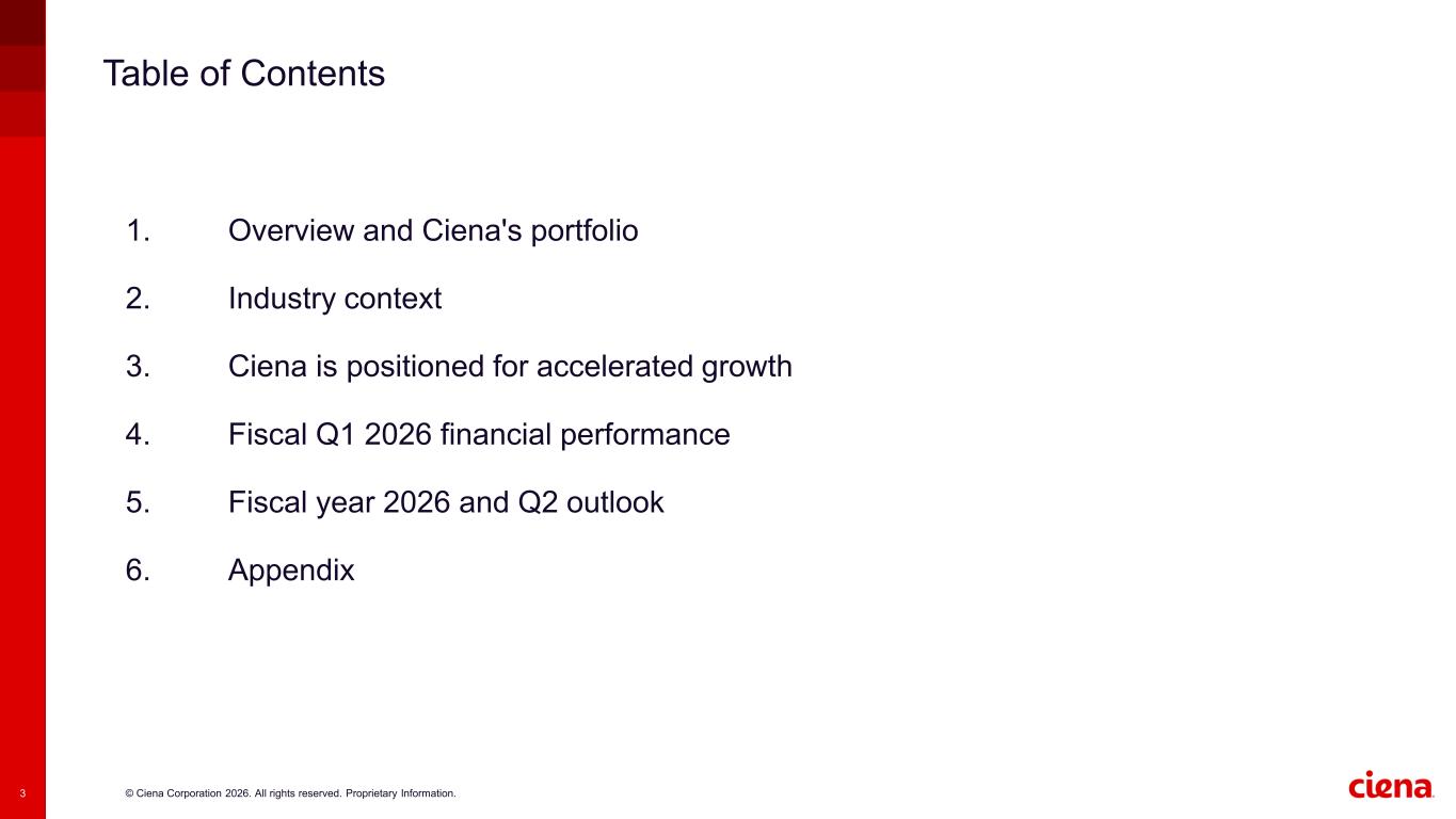 © Ciena Corporation 2026. All rights reserved. Proprietary Information.3 Table of Contents 1. Overview and Ciena's portfolio 2. Industry context 3. Ciena is positioned for accelerated growth 4. Fiscal Q1 2026 financial performance 5. Fiscal year 2026 and Q2 outlook 6. Appendix