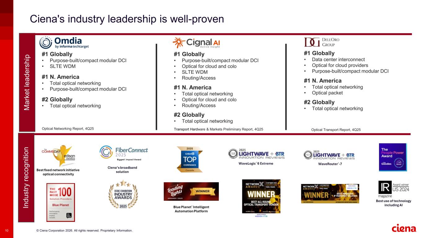 © Ciena Corporation 2026. All rights reserved. Proprietary Information.10 Ciena's industry leadership is well-proven #1 Globally • Data center interconnect • Optical for cloud providers • Purpose-built/compact modular DCI #1 N. America • Total optical networking • Optical packet #2 Globally • Total optical networking Optical Transport Report, 4Q25 #1 Globally • Purpose-built/compact modular DCI • SLTE WDM #1 N. America • Total optical networking • Purpose-built/compact modular DCI #2 Globally • Total optical networking Optical Networking Report, 4Q25 #1 Globally • Purpose-built/compact modular DCI • Optical for cloud and colo • SLTE WDM • Routing/Access #1 N. America • Total optical networking • Optical for cloud and colo • Routing/Access #2 Globally • Total optical networking Transport Hardware & Markets Preliminary Report, 4Q25 M a rk e t le a d e rs h ip In d u s tr y r e c o g n it io n