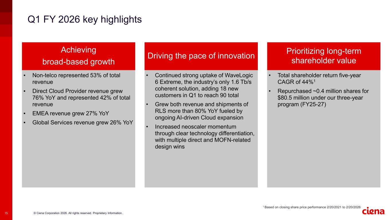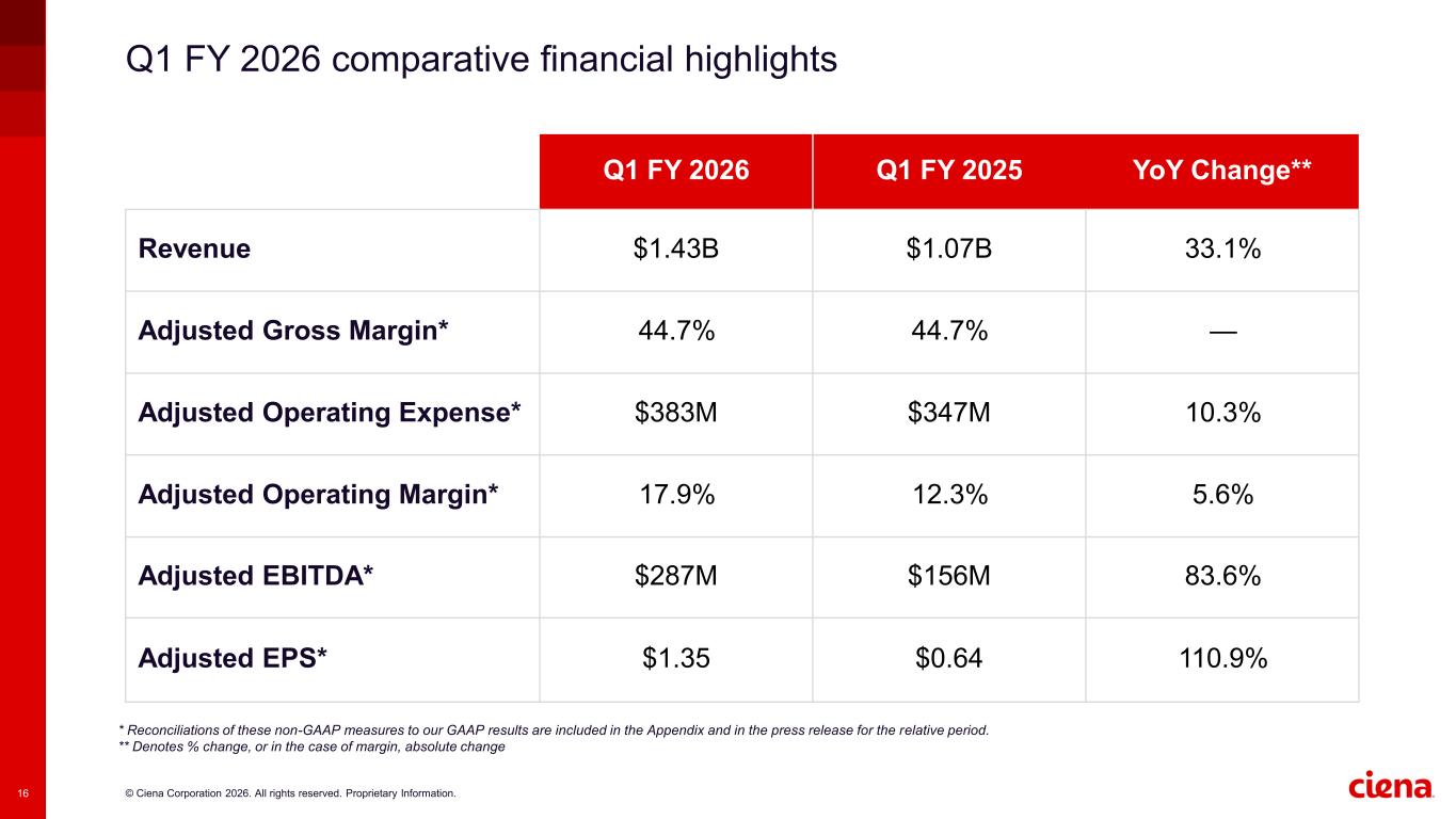 © Ciena Corporation 2026. All rights reserved. Proprietary Information.15 Q1 FY 2026 key highlights ▪ Non-telco represented 53% of total revenue ▪ Direct Cloud Provider revenue grew 76% YoY and represented 42% of total revenue ▪ EMEA revenue grew 27% YoY ▪ Global Services revenue grew 26% YoY • Continued strong uptake of WaveLogic 6 Extreme, the industry’s only 1.6 Tb/s coherent solution, adding 18 new customers in Q1 to reach 90 total • Grew both revenue and shipments of RLS more than 80% YoY fueled by ongoing AI-driven Cloud expansion • Increased neoscaler momentum through clear technology differentiation, with multiple direct and MOFN-related design wins • Total shareholder return five-year CAGR of 44%1 • Repurchased ~0.4 million shares for $80.5 million under our three-year program (FY25-27) 1 Based on closing share price performance 2/20/2021 to 2/20/2026 Achieving broad-based growth Prioritizing long-term shareholder value Driving the pace of innovation