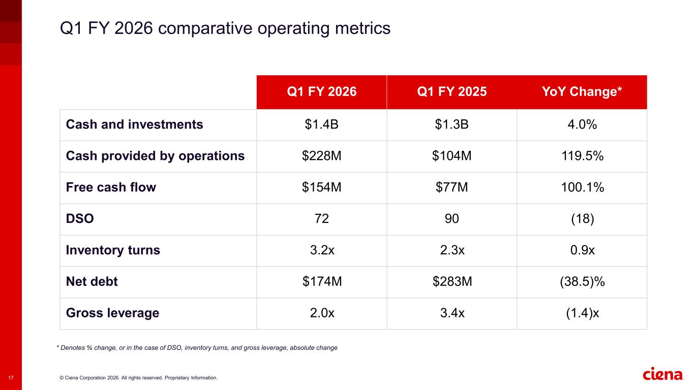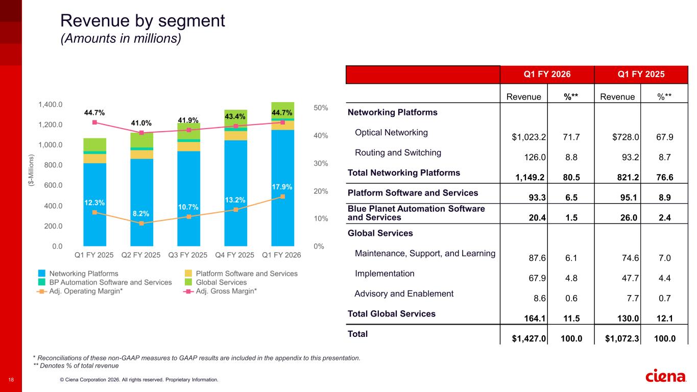 © Ciena Corporation 2026. All rights reserved. Proprietary Information.16 Q1 FY 2026 comparative financial highlights * Reconciliations of these non-GAAP measures to our GAAP results are included in the Appendix and in the press release for the relative period. ** Denotes % change, or in the case of margin, absolute change Q1 FY 2026 Q1 FY 2025 YoY Change** Revenue $1.43B $1.07B 33.1% Adjusted Gross Margin* 44.7% 44.7% — Adjusted Operating Expense* $383M $347M 10.3% Adjusted Operating Margin* 17.9% 12.3% 5.6% Adjusted EBITDA* $287M $156M 83.6% Adjusted EPS* $1.35 $0.64 110.9%