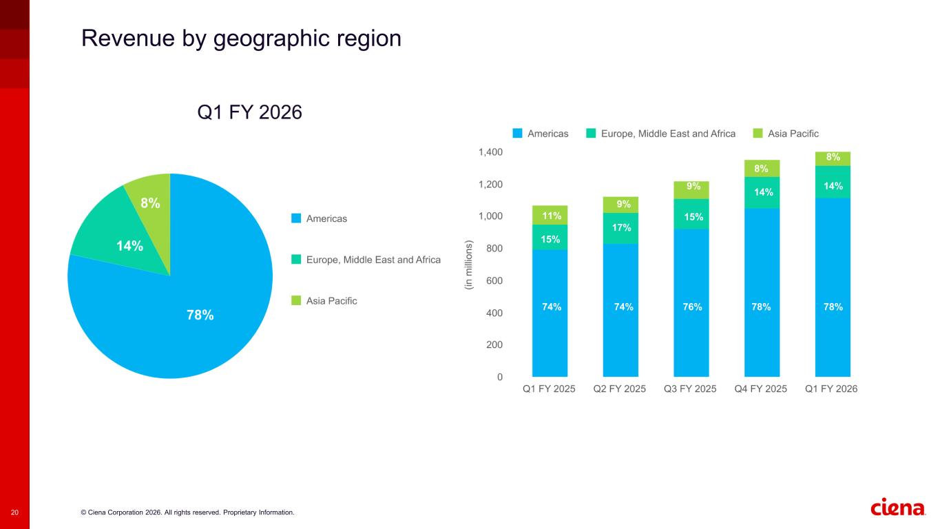 © Ciena Corporation 2026. All rights reserved. Proprietary Information.20 Revenue by geographic region 11% 9% 8% 15% 17% 14% 74% 74% 76% 78% 15% 9% 8% 14% 78%