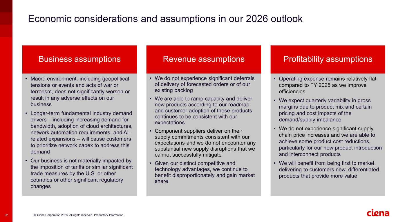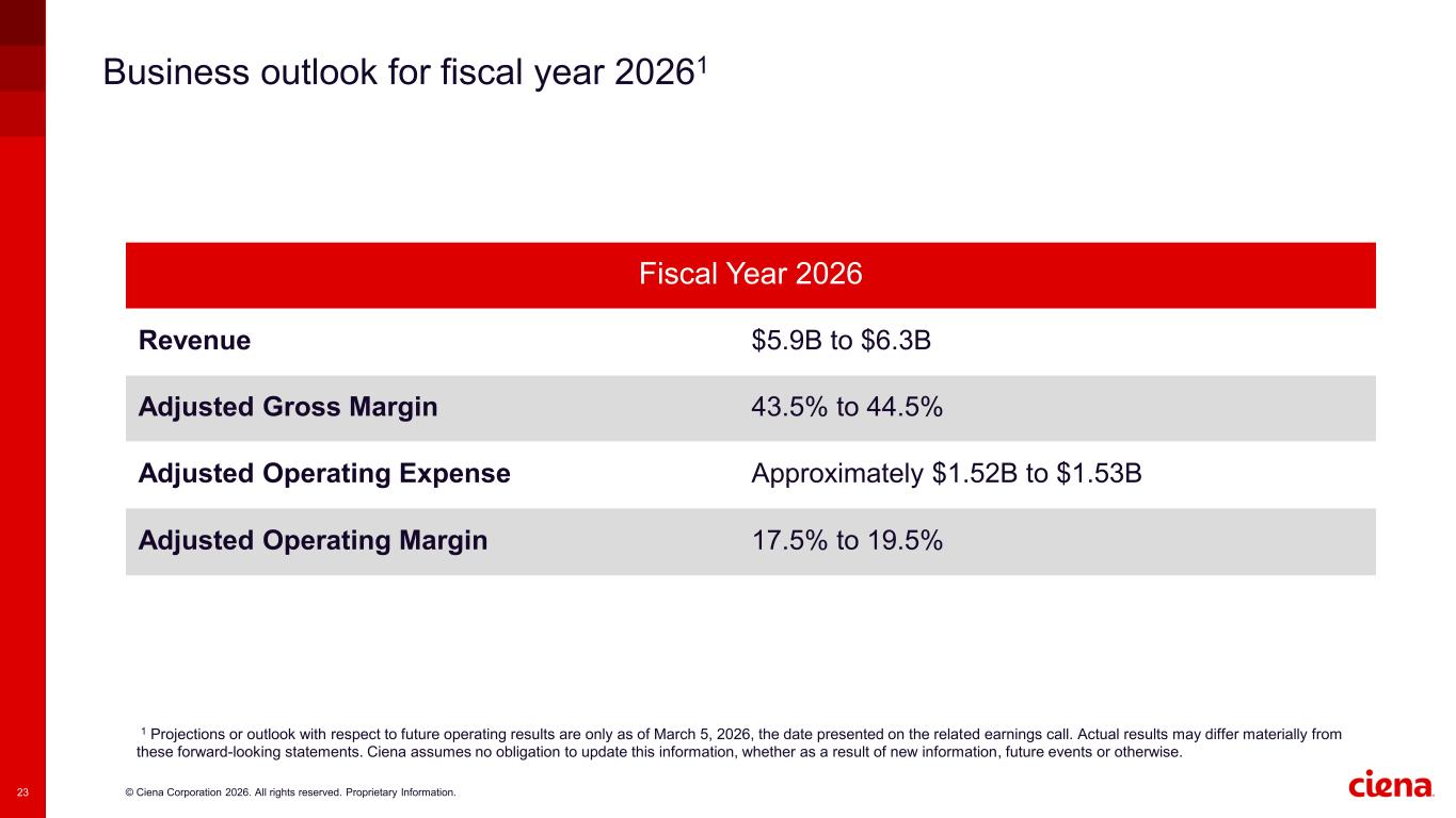 © Ciena Corporation 2026. All rights reserved. Proprietary Information.22 Economic considerations and assumptions in our 2026 outlook • We do not experience significant deferrals of delivery of forecasted orders or of our existing backlog • We are able to ramp capacity and deliver new products according to our roadmap and customer adoption of these products continues to be consistent with our expectations • Component suppliers deliver on their supply commitments consistent with our expectations and we do not encounter any substantial new supply disruptions that we cannot successfully mitigate • Given our distinct competitive and technology advantages, we continue to benefit disproportionately and gain market share Revenue assumptionsBusiness assumptions Profitability assumptions • Operating expense remains relatively flat compared to FY 2025 as we improve efficiencies • We expect quarterly variability in gross margins due to product mix and certain pricing and cost impacts of the demand/supply imbalance • We do not experience significant supply chain price increases and we are able to achieve some product cost reductions, particularly for our new product introduction and interconnect products • We will benefit from being first to market, delivering to customers new, differentiated products that provide more value • Macro environment, including geopolitical tensions or events and acts of war or terrorism, does not significantly worsen or result in any adverse effects on our business • Longer-term fundamental industry demand drivers – including increasing demand for bandwidth, adoption of cloud architectures, network automation requirements, and AI- related expansions – will cause customers to prioritize network capex to address this demand • Our business is not materially impacted by the imposition of tariffs or similar significant trade measures by the U.S. or other countries or other significant regulatory changes