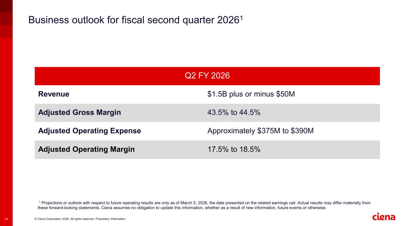 © Ciena Corporation 2026. All rights reserved. Proprietary Information.23 Business outlook for fiscal year 20261 1 Projections or outlook with respect to future operating results are only as of March 5, 2026, the date presented on the related earnings call. Actual results may differ materially from these forward-looking statements. Ciena assumes no obligation to update this information, whether as a result of new information, future events or otherwise. Fiscal Year 2026 Revenue $5.9B to $6.3B Adjusted Gross Margin 43.5% to 44.5% Adjusted Operating Expense Approximately $1.52B to $1.53B Adjusted Operating Margin 17.5% to 19.5%