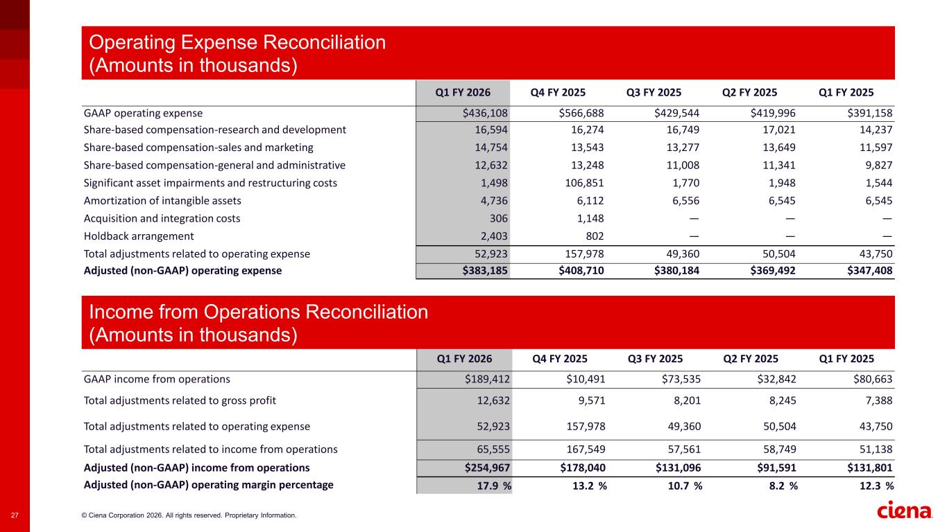 © Ciena Corporation 2026. All rights reserved. Proprietary Information.26 Q1 FY 2026 Q4 FY 2025 Q3 FY 2025 Q2 FY 2025 Q1 FY 2025 GAAP gross profit $625,520 $577,179 $503,079 $452,838 $471,821 Share-based compensation-products 1,822 1,964 2,027 2,033 1,750 Share-based compensation-services 4,025 3,857 3,942 3,980 3,405 Amortization of intangible assets 6,785 3,750 2,232 2,232 2,233 Total adjustments related to gross profit 12,632 9,571 8,201 8,245 7,388 Adjusted (non-GAAP) gross profit $638,152 $586,750 $511,280 $461,083 $479,209 Adjusted (non-GAAP) gross profit percentage 44.7 % 43.4 % 41.9 % 41.0 % 44.7 % Gross Profit Reconciliation (Amounts in thousands)
