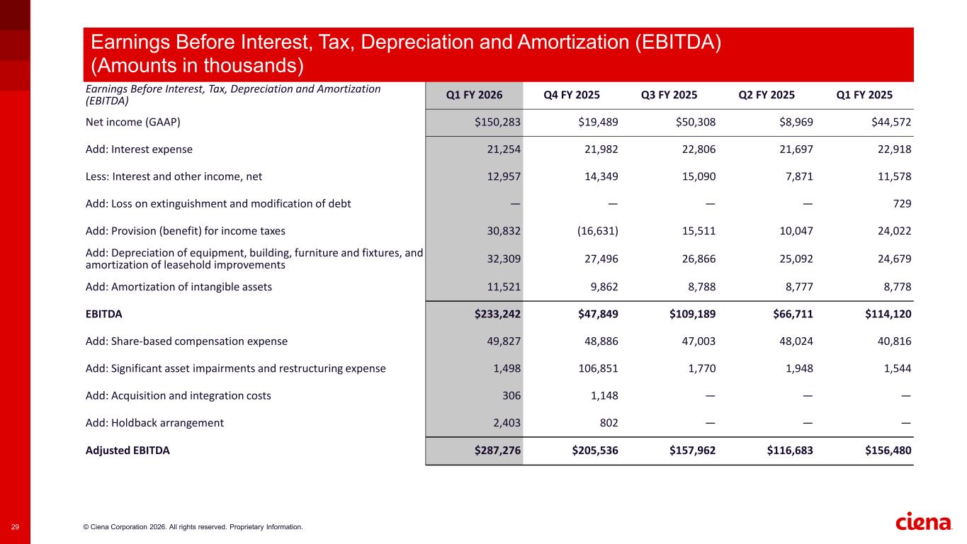 © Ciena Corporation 2026. All rights reserved. Proprietary Information.29 Earnings Before Interest, Tax, Depreciation and Amortization (EBITDA) Q1 FY 2026 Q4 FY 2025 Q3 FY 2025 Q2 FY 2025 Q1 FY 2025 Net income (GAAP) $150,283 $19,489 $50,308 $8,969 $44,572 Add: Interest expense 21,254 21,982 22,806 21,697 22,918 Less: Interest and other income, net 12,957 14,349 15,090 7,871 11,578 Add: Loss on extinguishment and modification of debt — — — — 729 Add: Provision (benefit) for income taxes 30,832 (16,631) 15,511 10,047 24,022 Add: Depreciation of equipment, building, furniture and fixtures, and amortization of leasehold improvements 32,309 27,496 26,866 25,092 24,679 Add: Amortization of intangible assets 11,521 9,862 8,788 8,777 8,778 EBITDA $233,242 $47,849 $109,189 $66,711 $114,120 Add: Share-based compensation expense 49,827 48,886 47,003 48,024 40,816 Add: Significant asset impairments and restructuring expense 1,498 106,851 1,770 1,948 1,544 Add: Acquisition and integration costs 306 1,148 — — — Add: Holdback arrangement 2,403 802 — — — Adjusted EBITDA $287,276 $205,536 $157,962 $116,683 $156,480 Earnings Before Interest, Tax, Depreciation and Amortization (EBITDA) (Amounts in thousands)