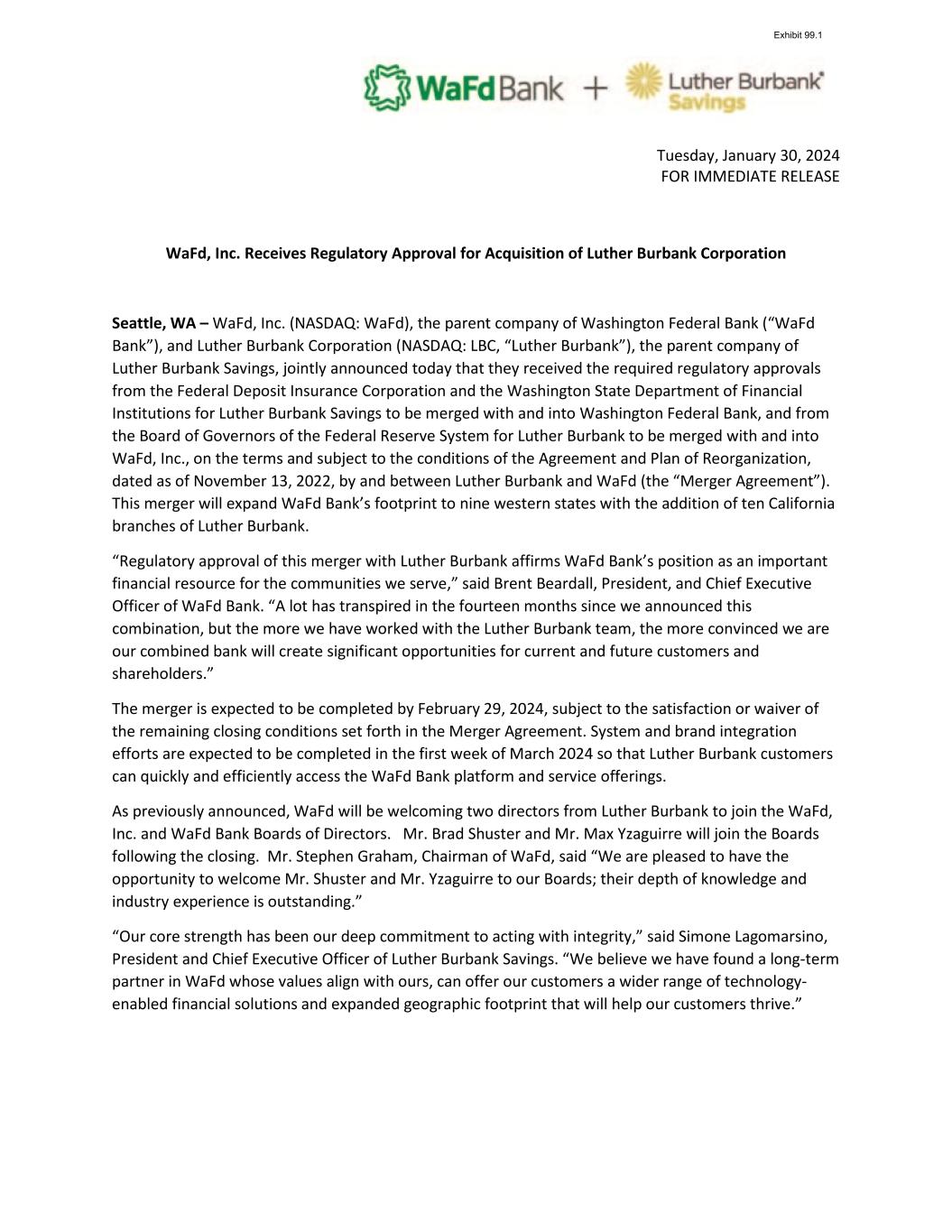 Tuesday, January 30, 2024 FOR IMMEDIATE RELEASE WaFd, Inc. Receives Regulatory Approval for Acquisition of Luther Burbank Corporation Seattle, WA – WaFd, Inc. (NASDAQ: WaFd), the parent company of Washington Federal Bank (“WaFd Bank”), and Luther Burbank Corporation (NASDAQ: LBC, “Luther Burbank”), the parent company of Luther Burbank Savings, jointly announced today that they received the required regulatory approvals from the Federal Deposit Insurance Corporation and the Washington State Department of Financial Institutions for Luther Burbank Savings to be merged with and into Washington Federal Bank, and from the Board of Governors of the Federal Reserve System for Luther Burbank to be merged with and into WaFd, Inc., on the terms and subject to the conditions of the Agreement and Plan of Reorganization, dated as of November 13, 2022, by and between Luther Burbank and WaFd (the “Merger Agreement”). This merger will expand WaFd Bank’s footprint to nine western states with the addition of ten California branches of Luther Burbank. “Regulatory approval of this merger with Luther Burbank affirms WaFd Bank’s position as an important financial resource for the communities we serve,” said Brent Beardall, President, and Chief Executive Officer of WaFd Bank. “A lot has transpired in the fourteen months since we announced this combination, but the more we have worked with the Luther Burbank team, the more convinced we are our combined bank will create significant opportunities for current and future customers and shareholders.” The merger is expected to be completed by February 29, 2024, subject to the satisfaction or waiver of the remaining closing conditions set forth in the Merger Agreement. System and brand integration efforts are expected to be completed in the first week of March 2024 so that Luther Burbank customers can quickly and efficiently access the WaFd Bank platform and service offerings. As previously announced, WaFd will be welcoming two directors from Luther Burbank to join the WaFd, Inc. and WaFd Bank Boards of Directors. Mr. Brad Shuster and Mr. Max Yzaguirre will join the Boards following the closing. Mr. Stephen Graham, Chairman of WaFd, said “We are pleased to have the opportunity to welcome Mr. Shuster and Mr. Yzaguirre to our Boards; their depth of knowledge and industry experience is outstanding.” “Our core strength has been our deep commitment to acting with integrity,” said Simone Lagomarsino, President and Chief Executive Officer of Luther Burbank Savings. “We believe we have found a long-term partner in WaFd whose values align with ours, can offer our customers a wider range of technology- enabled financial solutions and expanded geographic footprint that will help our customers thrive.” Exhibit 99.1