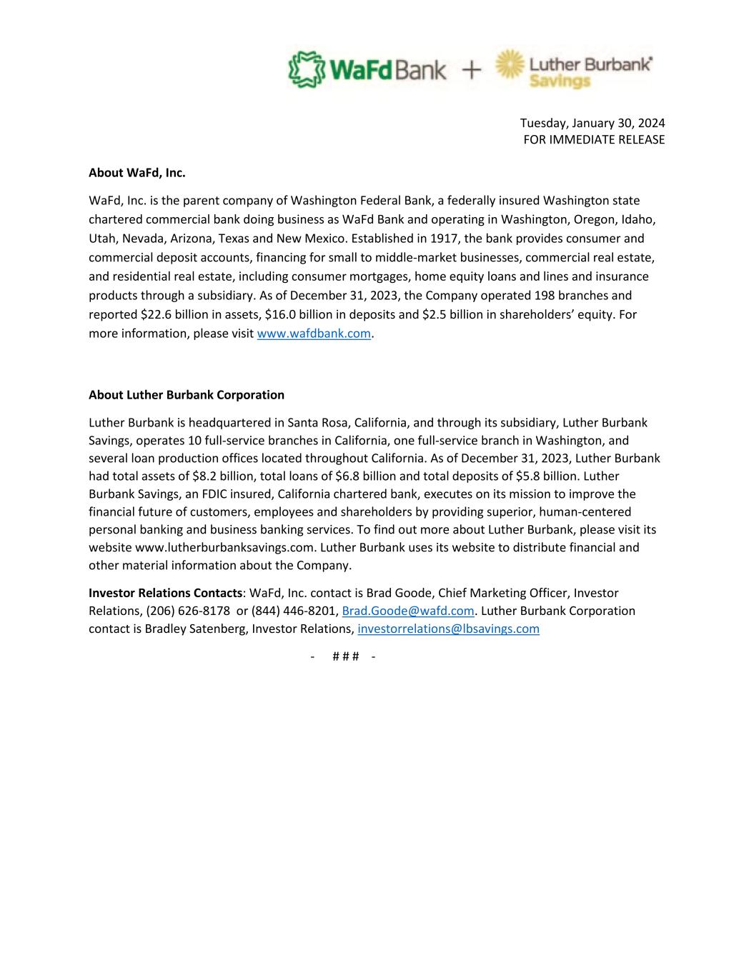 Tuesday, January 30, 2024 FOR IMMEDIATE RELEASE About WaFd, Inc. WaFd, Inc. is the parent company of Washington Federal Bank, a federally insured Washington state chartered commercial bank doing business as WaFd Bank and operating in Washington, Oregon, Idaho, Utah, Nevada, Arizona, Texas and New Mexico. Established in 1917, the bank provides consumer and commercial deposit accounts, financing for small to middle-market businesses, commercial real estate, and residential real estate, including consumer mortgages, home equity loans and lines and insurance products through a subsidiary. As of December 31, 2023, the Company operated 198 branches and reported $22.6 billion in assets, $16.0 billion in deposits and $2.5 billion in shareholders’ equity. For more information, please visit www.wafdbank.com. About Luther Burbank Corporation Luther Burbank is headquartered in Santa Rosa, California, and through its subsidiary, Luther Burbank Savings, operates 10 full-service branches in California, one full-service branch in Washington, and several loan production offices located throughout California. As of December 31, 2023, Luther Burbank had total assets of $8.2 billion, total loans of $6.8 billion and total deposits of $5.8 billion. Luther Burbank Savings, an FDIC insured, California chartered bank, executes on its mission to improve the financial future of customers, employees and shareholders by providing superior, human-centered personal banking and business banking services. To find out more about Luther Burbank, please visit its website www.lutherburbanksavings.com. Luther Burbank uses its website to distribute financial and other material information about the Company. Investor Relations Contacts: WaFd, Inc. contact is Brad Goode, Chief Marketing Officer, Investor Relations, (206) 626-8178 or (844) 446-8201, Brad.Goode@wafd.com. Luther Burbank Corporation contact is Bradley Satenberg, Investor Relations, investorrelations@lbsavings.com - # # # -