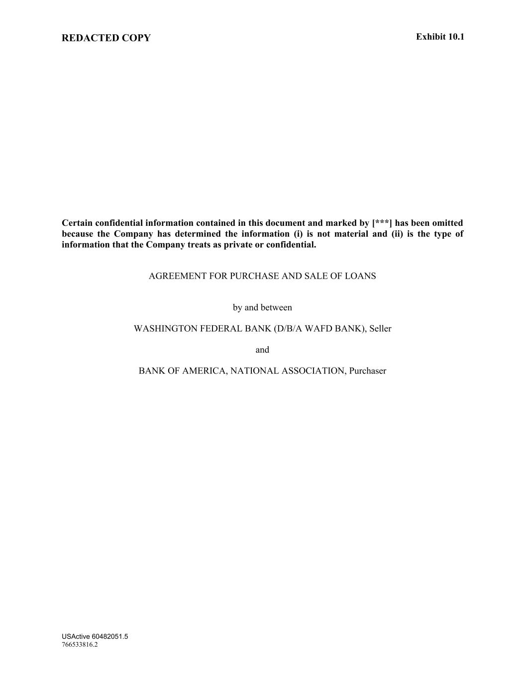 REDACTED COPY USActive 60482051.5 766533816.2 Certain confidential information contained in this document and marked by [***] has been omitted because the Company has determined the information (i) is not material and (ii) is the type of information that the Company treats as private or confidential. AGREEMENT FOR PURCHASE AND SALE OF LOANS by and between WASHINGTON FEDERAL BANK (D/B/A WAFD BANK), Seller and BANK OF AMERICA, NATIONAL ASSOCIATION, Purchaser Exhibit 10.1