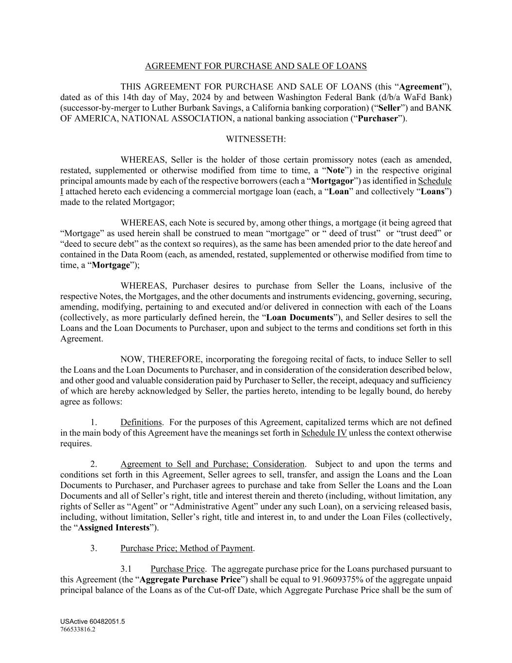 USActive 60482051.5 766533816.2 AGREEMENT FOR PURCHASE AND SALE OF LOANS THIS AGREEMENT FOR PURCHASE AND SALE OF LOANS (this “Agreement”), dated as of this 14th day of May, 2024 by and between Washington Federal Bank (d/b/a WaFd Bank) (successor-by-merger to Luther Burbank Savings, a California banking corporation) (“Seller”) and BANK OF AMERICA, NATIONAL ASSOCIATION, a national banking association (“Purchaser”). WITNESSETH: WHEREAS, Seller is the holder of those certain promissory notes (each as amended, restated, supplemented or otherwise modified from time to time, a “Note”) in the respective original principal amounts made by each of the respective borrowers (each a “Mortgagor”) as identified in Schedule I attached hereto each evidencing a commercial mortgage loan (each, a “Loan” and collectively “Loans”) made to the related Mortgagor; WHEREAS, each Note is secured by, among other things, a mortgage (it being agreed that “Mortgage” as used herein shall be construed to mean “mortgage” or “ deed of trust” or “trust deed” or “deed to secure debt” as the context so requires), as the same has been amended prior to the date hereof and contained in the Data Room (each, as amended, restated, supplemented or otherwise modified from time to time, a “Mortgage”); WHEREAS, Purchaser desires to purchase from Seller the Loans, inclusive of the respective Notes, the Mortgages, and the other documents and instruments evidencing, governing, securing, amending, modifying, pertaining to and executed and/or delivered in connection with each of the Loans (collectively, as more particularly defined herein, the “Loan Documents”), and Seller desires to sell the Loans and the Loan Documents to Purchaser, upon and subject to the terms and conditions set forth in this Agreement. NOW, THEREFORE, incorporating the foregoing recital of facts, to induce Seller to sell the Loans and the Loan Documents to Purchaser, and in consideration of the consideration described below, and other good and valuable consideration paid by Purchaser to Seller, the receipt, adequacy and sufficiency of which are hereby acknowledged by Seller, the parties hereto, intending to be legally bound, do hereby agree as follows: 1. Definitions. For the purposes of this Agreement, capitalized terms which are not defined in the main body of this Agreement have the meanings set forth in Schedule IV unless the context otherwise requires. 2. Agreement to Sell and Purchase; Consideration. Subject to and upon the terms and conditions set forth in this Agreement, Seller agrees to sell, transfer, and assign the Loans and the Loan Documents to Purchaser, and Purchaser agrees to purchase and take from Seller the Loans and the Loan Documents and all of Seller’s right, title and interest therein and thereto (including, without limitation, any rights of Seller as “Agent” or “Administrative Agent” under any such Loan), on a servicing released basis, including, without limitation, Seller’s right, title and interest in, to and under the Loan Files (collectively, the “Assigned Interests”). 3. Purchase Price; Method of Payment. 3.1 Purchase Price. The aggregate purchase price for the Loans purchased pursuant to this Agreement (the “Aggregate Purchase Price”) shall be equal to 91.9609375% of the aggregate unpaid principal balance of the Loans as of the Cut-off Date, which Aggregate Purchase Price shall be the sum of