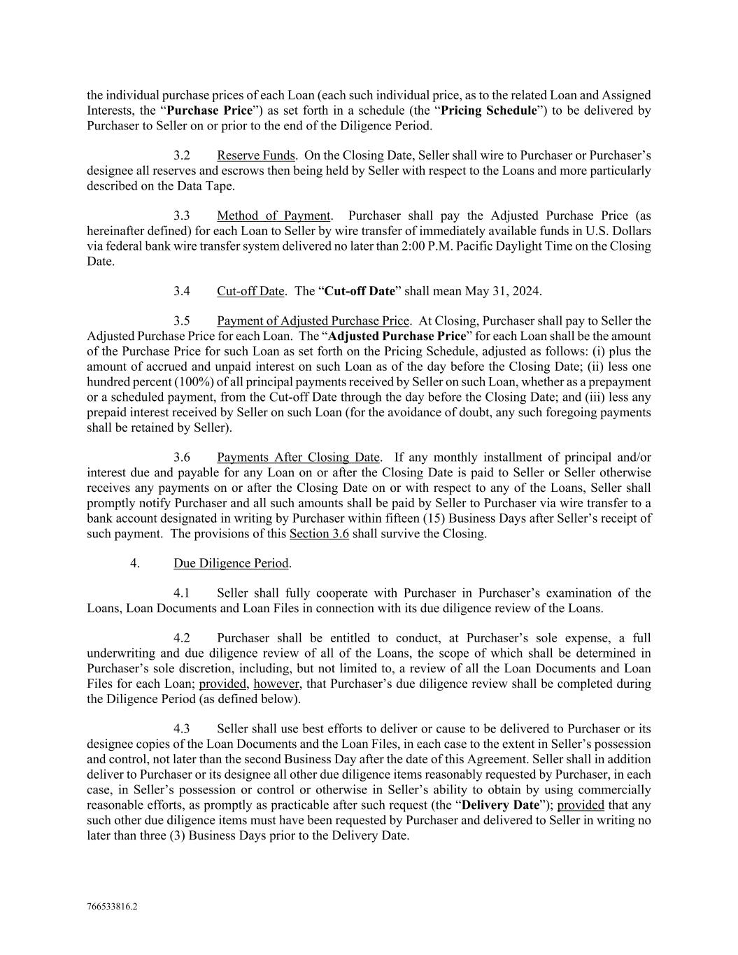 766533816.2 the individual purchase prices of each Loan (each such individual price, as to the related Loan and Assigned Interests, the “Purchase Price”) as set forth in a schedule (the “Pricing Schedule”) to be delivered by Purchaser to Seller on or prior to the end of the Diligence Period. 3.2 Reserve Funds. On the Closing Date, Seller shall wire to Purchaser or Purchaser’s designee all reserves and escrows then being held by Seller with respect to the Loans and more particularly described on the Data Tape. 3.3 Method of Payment. Purchaser shall pay the Adjusted Purchase Price (as hereinafter defined) for each Loan to Seller by wire transfer of immediately available funds in U.S. Dollars via federal bank wire transfer system delivered no later than 2:00 P.M. Pacific Daylight Time on the Closing Date. 3.4 Cut-off Date. The “Cut-off Date” shall mean May 31, 2024. 3.5 Payment of Adjusted Purchase Price. At Closing, Purchaser shall pay to Seller the Adjusted Purchase Price for each Loan. The “Adjusted Purchase Price” for each Loan shall be the amount of the Purchase Price for such Loan as set forth on the Pricing Schedule, adjusted as follows: (i) plus the amount of accrued and unpaid interest on such Loan as of the day before the Closing Date; (ii) less one hundred percent (100%) of all principal payments received by Seller on such Loan, whether as a prepayment or a scheduled payment, from the Cut-off Date through the day before the Closing Date; and (iii) less any prepaid interest received by Seller on such Loan (for the avoidance of doubt, any such foregoing payments shall be retained by Seller). 3.6 Payments After Closing Date. If any monthly installment of principal and/or interest due and payable for any Loan on or after the Closing Date is paid to Seller or Seller otherwise receives any payments on or after the Closing Date on or with respect to any of the Loans, Seller shall promptly notify Purchaser and all such amounts shall be paid by Seller to Purchaser via wire transfer to a bank account designated in writing by Purchaser within fifteen (15) Business Days after Seller’s receipt of such payment. The provisions of this Section 3.6 shall survive the Closing. 4. Due Diligence Period. 4.1 Seller shall fully cooperate with Purchaser in Purchaser’s examination of the Loans, Loan Documents and Loan Files in connection with its due diligence review of the Loans. 4.2 Purchaser shall be entitled to conduct, at Purchaser’s sole expense, a full underwriting and due diligence review of all of the Loans, the scope of which shall be determined in Purchaser’s sole discretion, including, but not limited to, a review of all the Loan Documents and Loan Files for each Loan; provided, however, that Purchaser’s due diligence review shall be completed during the Diligence Period (as defined below). 4.3 Seller shall use best efforts to deliver or cause to be delivered to Purchaser or its designee copies of the Loan Documents and the Loan Files, in each case to the extent in Seller’s possession and control, not later than the second Business Day after the date of this Agreement. Seller shall in addition deliver to Purchaser or its designee all other due diligence items reasonably requested by Purchaser, in each case, in Seller’s possession or control or otherwise in Seller’s ability to obtain by using commercially reasonable efforts, as promptly as practicable after such request (the “Delivery Date”); provided that any such other due diligence items must have been requested by Purchaser and delivered to Seller in writing no later than three (3) Business Days prior to the Delivery Date.