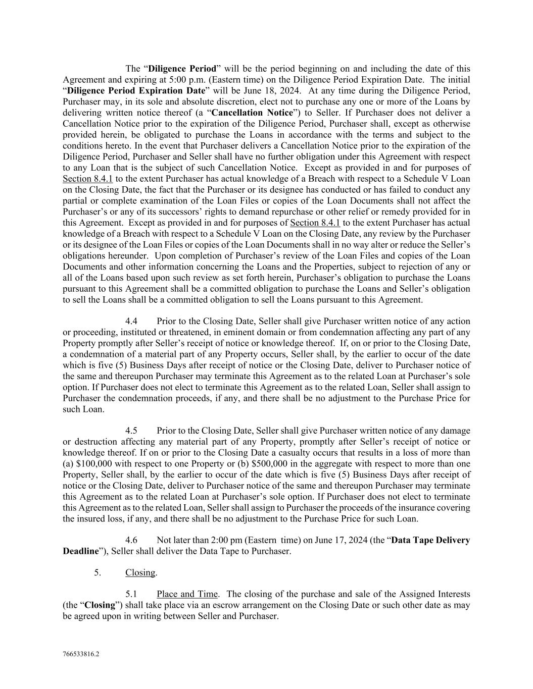 766533816.2 The “Diligence Period” will be the period beginning on and including the date of this Agreement and expiring at 5:00 p.m. (Eastern time) on the Diligence Period Expiration Date. The initial “Diligence Period Expiration Date” will be June 18, 2024. At any time during the Diligence Period, Purchaser may, in its sole and absolute discretion, elect not to purchase any one or more of the Loans by delivering written notice thereof (a “Cancellation Notice”) to Seller. If Purchaser does not deliver a Cancellation Notice prior to the expiration of the Diligence Period, Purchaser shall, except as otherwise provided herein, be obligated to purchase the Loans in accordance with the terms and subject to the conditions hereto. In the event that Purchaser delivers a Cancellation Notice prior to the expiration of the Diligence Period, Purchaser and Seller shall have no further obligation under this Agreement with respect to any Loan that is the subject of such Cancellation Notice. Except as provided in and for purposes of Section 8.4.1 to the extent Purchaser has actual knowledge of a Breach with respect to a Schedule V Loan on the Closing Date, the fact that the Purchaser or its designee has conducted or has failed to conduct any partial or complete examination of the Loan Files or copies of the Loan Documents shall not affect the Purchaser’s or any of its successors’ rights to demand repurchase or other relief or remedy provided for in this Agreement. Except as provided in and for purposes of Section 8.4.1 to the extent Purchaser has actual knowledge of a Breach with respect to a Schedule V Loan on the Closing Date, any review by the Purchaser or its designee of the Loan Files or copies of the Loan Documents shall in no way alter or reduce the Seller’s obligations hereunder. Upon completion of Purchaser’s review of the Loan Files and copies of the Loan Documents and other information concerning the Loans and the Properties, subject to rejection of any or all of the Loans based upon such review as set forth herein, Purchaser’s obligation to purchase the Loans pursuant to this Agreement shall be a committed obligation to purchase the Loans and Seller’s obligation to sell the Loans shall be a committed obligation to sell the Loans pursuant to this Agreement. 4.4 Prior to the Closing Date, Seller shall give Purchaser written notice of any action or proceeding, instituted or threatened, in eminent domain or from condemnation affecting any part of any Property promptly after Seller’s receipt of notice or knowledge thereof. If, on or prior to the Closing Date, a condemnation of a material part of any Property occurs, Seller shall, by the earlier to occur of the date which is five (5) Business Days after receipt of notice or the Closing Date, deliver to Purchaser notice of the same and thereupon Purchaser may terminate this Agreement as to the related Loan at Purchaser’s sole option. If Purchaser does not elect to terminate this Agreement as to the related Loan, Seller shall assign to Purchaser the condemnation proceeds, if any, and there shall be no adjustment to the Purchase Price for such Loan. 4.5 Prior to the Closing Date, Seller shall give Purchaser written notice of any damage or destruction affecting any material part of any Property, promptly after Seller’s receipt of notice or knowledge thereof. If on or prior to the Closing Date a casualty occurs that results in a loss of more than (a) $100,000 with respect to one Property or (b) $500,000 in the aggregate with respect to more than one Property, Seller shall, by the earlier to occur of the date which is five (5) Business Days after receipt of notice or the Closing Date, deliver to Purchaser notice of the same and thereupon Purchaser may terminate this Agreement as to the related Loan at Purchaser’s sole option. If Purchaser does not elect to terminate this Agreement as to the related Loan, Seller shall assign to Purchaser the proceeds of the insurance covering the insured loss, if any, and there shall be no adjustment to the Purchase Price for such Loan. 4.6 Not later than 2:00 pm (Eastern time) on June 17, 2024 (the “Data Tape Delivery Deadline”), Seller shall deliver the Data Tape to Purchaser. 5. Closing. 5.1 Place and Time. The closing of the purchase and sale of the Assigned Interests (the “Closing”) shall take place via an escrow arrangement on the Closing Date or such other date as may be agreed upon in writing between Seller and Purchaser.