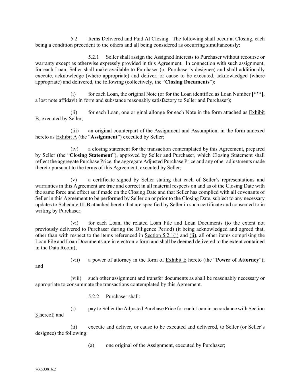 766533816.2 5.2 Items Delivered and Paid At Closing. The following shall occur at Closing, each being a condition precedent to the others and all being considered as occurring simultaneously: 5.2.1 Seller shall assign the Assigned Interests to Purchaser without recourse or warranty except as otherwise expressly provided in this Agreement. In connection with such assignment, for each Loan, Seller shall make available to Purchaser (or Purchaser’s designee) and shall additionally execute, acknowledge (where appropriate) and deliver, or cause to be executed, acknowledged (where appropriate) and delivered, the following (collectively, the “Closing Documents”): (i) for each Loan, the original Note (or for the Loan identified as Loan Number [***], a lost note affidavit in form and substance reasonably satisfactory to Seller and Purchaser); (ii) for each Loan, one original allonge for each Note in the form attached as Exhibit B, executed by Seller; (iii) an original counterpart of the Assignment and Assumption, in the form annexed hereto as Exhibit A (the “Assignment”) executed by Seller; (iv) a closing statement for the transaction contemplated by this Agreement, prepared by Seller (the “Closing Statement”), approved by Seller and Purchaser, which Closing Statement shall reflect the aggregate Purchase Price, the aggregate Adjusted Purchase Price and any other adjustments made thereto pursuant to the terms of this Agreement, executed by Seller; (v) a certificate signed by Seller stating that each of Seller’s representations and warranties in this Agreement are true and correct in all material respects on and as of the Closing Date with the same force and effect as if made on the Closing Date and that Seller has complied with all covenants of Seller in this Agreement to be performed by Seller on or prior to the Closing Date, subject to any necessary updates to Schedule III-B attached hereto that are specified by Seller in such certificate and consented to in writing by Purchaser; (vi) for each Loan, the related Loan File and Loan Documents (to the extent not previously delivered to Purchaser during the Diligence Period) (it being acknowledged and agreed that, other than with respect to the items referenced in Section 5.2.1(i) and (ii), all other items comprising the Loan File and Loan Documents are in electronic form and shall be deemed delivered to the extent contained in the Data Room); (vii) a power of attorney in the form of Exhibit E hereto (the “Power of Attorney”); and (viii) such other assignment and transfer documents as shall be reasonably necessary or appropriate to consummate the transactions contemplated by this Agreement. 5.2.2 Purchaser shall: (i) pay to Seller the Adjusted Purchase Price for each Loan in accordance with Section 3 hereof; and (ii) execute and deliver, or cause to be executed and delivered, to Seller (or Seller’s designee) the following: (a) one original of the Assignment, executed by Purchaser;