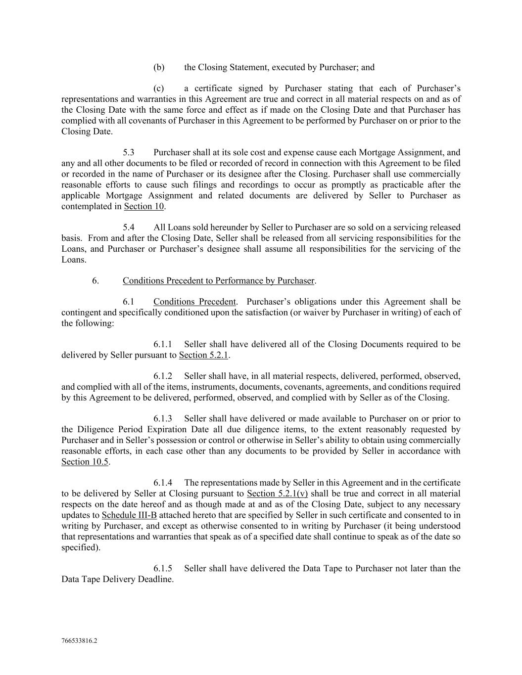 766533816.2 (b) the Closing Statement, executed by Purchaser; and (c) a certificate signed by Purchaser stating that each of Purchaser’s representations and warranties in this Agreement are true and correct in all material respects on and as of the Closing Date with the same force and effect as if made on the Closing Date and that Purchaser has complied with all covenants of Purchaser in this Agreement to be performed by Purchaser on or prior to the Closing Date. 5.3 Purchaser shall at its sole cost and expense cause each Mortgage Assignment, and any and all other documents to be filed or recorded of record in connection with this Agreement to be filed or recorded in the name of Purchaser or its designee after the Closing. Purchaser shall use commercially reasonable efforts to cause such filings and recordings to occur as promptly as practicable after the applicable Mortgage Assignment and related documents are delivered by Seller to Purchaser as contemplated in Section 10. 5.4 All Loans sold hereunder by Seller to Purchaser are so sold on a servicing released basis. From and after the Closing Date, Seller shall be released from all servicing responsibilities for the Loans, and Purchaser or Purchaser’s designee shall assume all responsibilities for the servicing of the Loans. 6. Conditions Precedent to Performance by Purchaser. 6.1 Conditions Precedent. Purchaser’s obligations under this Agreement shall be contingent and specifically conditioned upon the satisfaction (or waiver by Purchaser in writing) of each of the following: 6.1.1 Seller shall have delivered all of the Closing Documents required to be delivered by Seller pursuant to Section 5.2.1. 6.1.2 Seller shall have, in all material respects, delivered, performed, observed, and complied with all of the items, instruments, documents, covenants, agreements, and conditions required by this Agreement to be delivered, performed, observed, and complied with by Seller as of the Closing. 6.1.3 Seller shall have delivered or made available to Purchaser on or prior to the Diligence Period Expiration Date all due diligence items, to the extent reasonably requested by Purchaser and in Seller’s possession or control or otherwise in Seller’s ability to obtain using commercially reasonable efforts, in each case other than any documents to be provided by Seller in accordance with Section 10.5. 6.1.4 The representations made by Seller in this Agreement and in the certificate to be delivered by Seller at Closing pursuant to Section 5.2.1(v) shall be true and correct in all material respects on the date hereof and as though made at and as of the Closing Date, subject to any necessary updates to Schedule III-B attached hereto that are specified by Seller in such certificate and consented to in writing by Purchaser, and except as otherwise consented to in writing by Purchaser (it being understood that representations and warranties that speak as of a specified date shall continue to speak as of the date so specified). 6.1.5 Seller shall have delivered the Data Tape to Purchaser not later than the Data Tape Delivery Deadline.