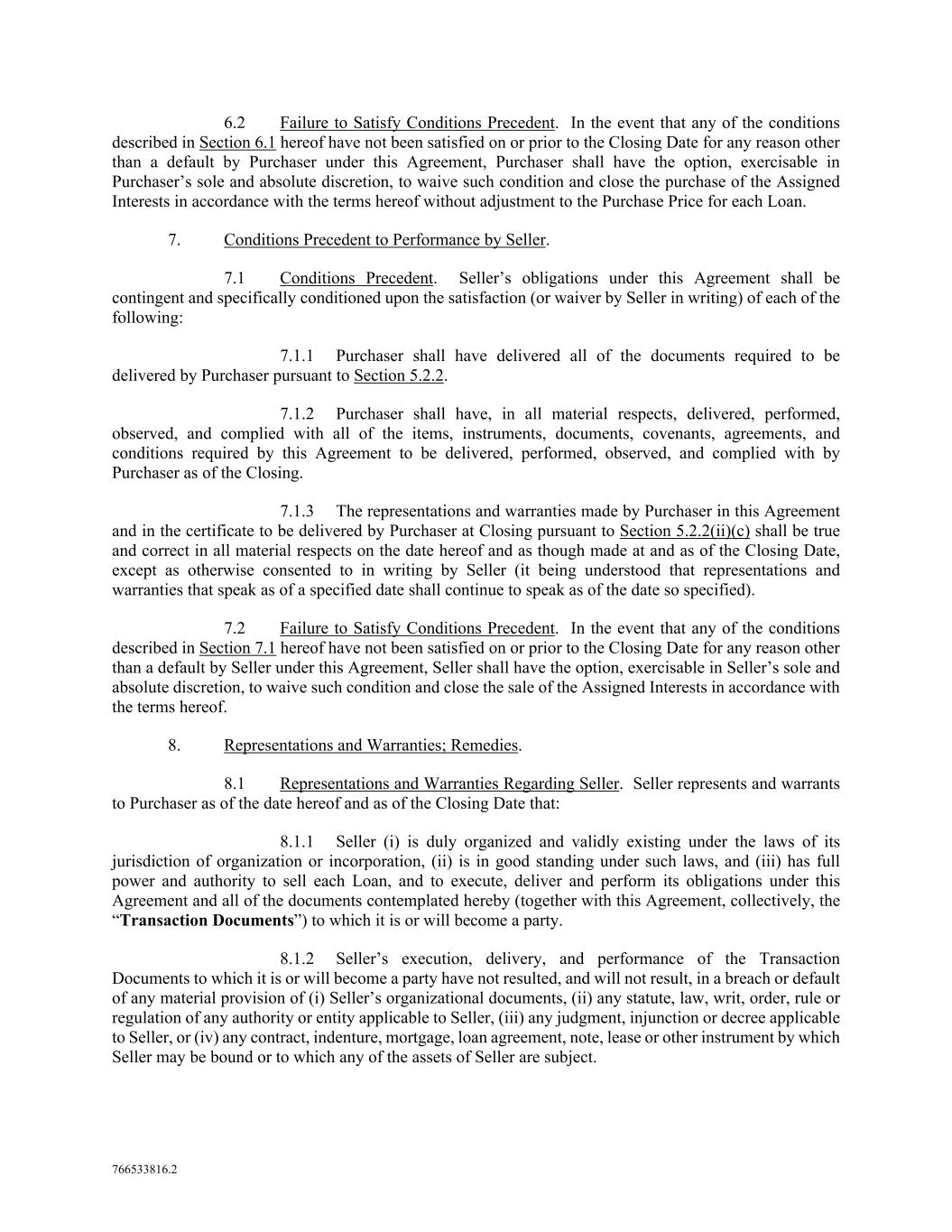 766533816.2 6.2 Failure to Satisfy Conditions Precedent. In the event that any of the conditions described in Section 6.1 hereof have not been satisfied on or prior to the Closing Date for any reason other than a default by Purchaser under this Agreement, Purchaser shall have the option, exercisable in Purchaser’s sole and absolute discretion, to waive such condition and close the purchase of the Assigned Interests in accordance with the terms hereof without adjustment to the Purchase Price for each Loan. 7. Conditions Precedent to Performance by Seller. 7.1 Conditions Precedent. Seller’s obligations under this Agreement shall be contingent and specifically conditioned upon the satisfaction (or waiver by Seller in writing) of each of the following: 7.1.1 Purchaser shall have delivered all of the documents required to be delivered by Purchaser pursuant to Section 5.2.2. 7.1.2 Purchaser shall have, in all material respects, delivered, performed, observed, and complied with all of the items, instruments, documents, covenants, agreements, and conditions required by this Agreement to be delivered, performed, observed, and complied with by Purchaser as of the Closing. 7.1.3 The representations and warranties made by Purchaser in this Agreement and in the certificate to be delivered by Purchaser at Closing pursuant to Section 5.2.2(ii)(c) shall be true and correct in all material respects on the date hereof and as though made at and as of the Closing Date, except as otherwise consented to in writing by Seller (it being understood that representations and warranties that speak as of a specified date shall continue to speak as of the date so specified). 7.2 Failure to Satisfy Conditions Precedent. In the event that any of the conditions described in Section 7.1 hereof have not been satisfied on or prior to the Closing Date for any reason other than a default by Seller under this Agreement, Seller shall have the option, exercisable in Seller’s sole and absolute discretion, to waive such condition and close the sale of the Assigned Interests in accordance with the terms hereof. 8. Representations and Warranties; Remedies. 8.1 Representations and Warranties Regarding Seller. Seller represents and warrants to Purchaser as of the date hereof and as of the Closing Date that: 8.1.1 Seller (i) is duly organized and validly existing under the laws of its jurisdiction of organization or incorporation, (ii) is in good standing under such laws, and (iii) has full power and authority to sell each Loan, and to execute, deliver and perform its obligations under this Agreement and all of the documents contemplated hereby (together with this Agreement, collectively, the “Transaction Documents”) to which it is or will become a party. 8.1.2 Seller’s execution, delivery, and performance of the Transaction Documents to which it is or will become a party have not resulted, and will not result, in a breach or default of any material provision of (i) Seller’s organizational documents, (ii) any statute, law, writ, order, rule or regulation of any authority or entity applicable to Seller, (iii) any judgment, injunction or decree applicable to Seller, or (iv) any contract, indenture, mortgage, loan agreement, note, lease or other instrument by which Seller may be bound or to which any of the assets of Seller are subject.