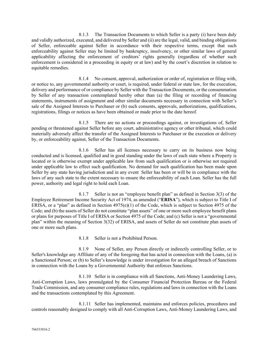 766533816.2 8.1.3 The Transaction Documents to which Seller is a party (i) have been duly and validly authorized, executed, and delivered by Seller and (ii) are the legal, valid, and binding obligations of Seller, enforceable against Seller in accordance with their respective terms, except that such enforceability against Seller may be limited by bankruptcy, insolvency, or other similar laws of general applicability affecting the enforcement of creditors’ rights generally (regardless of whether such enforcement is considered in a proceeding in equity or at law) and by the court’s discretion in relation to equitable remedies. 8.1.4 No consent, approval, authorization or order of, registration or filing with, or notice to, any governmental authority or court, is required, under federal or state law, for the execution, delivery and performance of or compliance by Seller with the Transaction Documents, or the consummation by Seller of any transaction contemplated hereby other than (a) the filing or recording of financing statements, instruments of assignment and other similar documents necessary in connection with Seller’s sale of the Assigned Interests to Purchaser or (b) such consents, approvals, authorizations, qualifications, registrations, filings or notices as have been obtained or made prior to the date hereof. 8.1.5 There are no actions or proceedings against, or investigations of, Seller pending or threatened against Seller before any court, administrative agency or other tribunal, which could materially adversely affect the transfer of the Assigned Interests to Purchaser or the execution or delivery by, or enforceability against, Seller of the Transaction Documents. 8.1.6 Seller has all licenses necessary to carry on its business now being conducted and is licensed, qualified and in good standing under the laws of each state where a Property is located or is otherwise exempt under applicable law from such qualification or is otherwise not required under applicable law to effect such qualification. No demand for such qualification has been made upon Seller by any state having jurisdiction and in any event Seller has been or will be in compliance with the laws of any such state to the extent necessary to ensure the enforceability of each Loan. Seller has the full power, authority and legal right to hold each Loan. 8.1.7 Seller is not an “employee benefit plan” as defined in Section 3(3) of the Employee Retirement Income Security Act of 1974, as amended (“ERISA”), which is subject to Title I of ERISA, or a “plan” as defined in Section 4975(e)(1) of the Code, which is subject to Section 4975 of the Code; and (b) the assets of Seller do not constitute “plan assets” of one or more such employee benefit plans or plans for purposes of Title I of ERISA or Section 4975 of the Code; and (c) Seller is not a “governmental plan” within the meaning of Section 3(32) of ERISA, and assets of Seller do not constitute plan assets of one or more such plans. 8.1.8 Seller is not a Prohibited Person. 8.1.9 None of Seller, any Person directly or indirectly controlling Seller, or to Seller's knowledge any Affiliate of any of the foregoing that has acted in connection with the Loans, (a) is a Sanctioned Person; or (b) to Seller’s knowledge is under investigation for an alleged breach of Sanctions in connection with the Loans by a Governmental Authority that enforces Sanctions. 8.1.10 Seller is in compliance with all Sanctions, Anti-Money Laundering Laws, Anti-Corruption Laws, laws promulgated by the Consumer Financial Protection Bureau or the Federal Trade Commission, and any consumer compliance rules, regulations and laws in connection with the Loans and the transactions contemplated by this Agreement. 8.1.11 Seller has implemented, maintains and enforces policies, procedures and controls reasonably designed to comply with all Anti-Corruption Laws, Anti-Money Laundering Laws, and