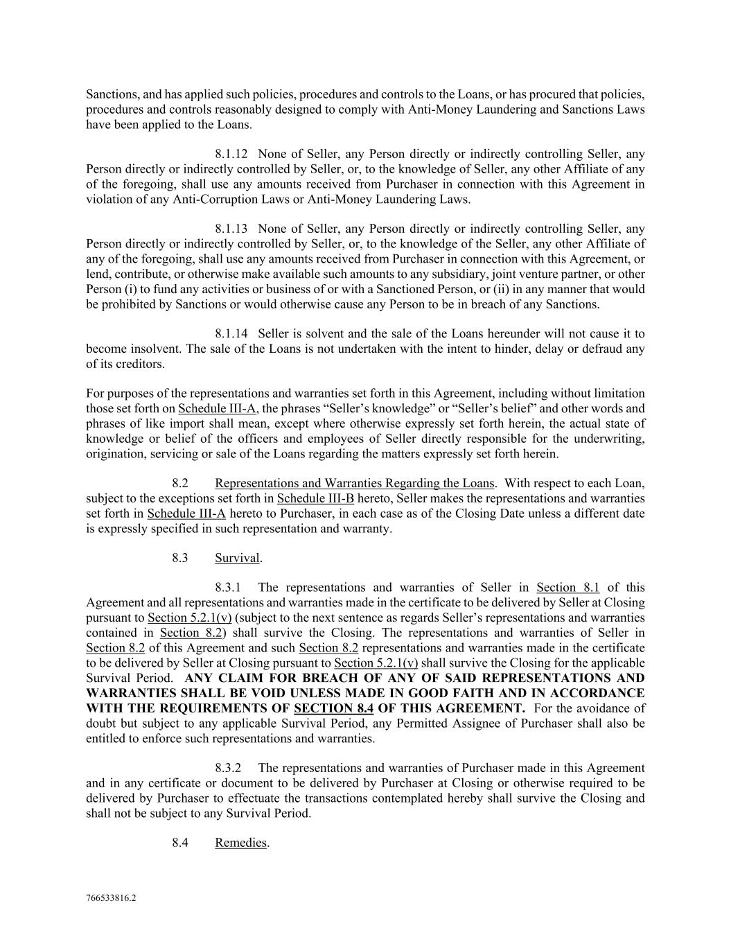 766533816.2 Sanctions, and has applied such policies, procedures and controls to the Loans, or has procured that policies, procedures and controls reasonably designed to comply with Anti-Money Laundering and Sanctions Laws have been applied to the Loans. 8.1.12 None of Seller, any Person directly or indirectly controlling Seller, any Person directly or indirectly controlled by Seller, or, to the knowledge of Seller, any other Affiliate of any of the foregoing, shall use any amounts received from Purchaser in connection with this Agreement in violation of any Anti-Corruption Laws or Anti-Money Laundering Laws. 8.1.13 None of Seller, any Person directly or indirectly controlling Seller, any Person directly or indirectly controlled by Seller, or, to the knowledge of the Seller, any other Affiliate of any of the foregoing, shall use any amounts received from Purchaser in connection with this Agreement, or lend, contribute, or otherwise make available such amounts to any subsidiary, joint venture partner, or other Person (i) to fund any activities or business of or with a Sanctioned Person, or (ii) in any manner that would be prohibited by Sanctions or would otherwise cause any Person to be in breach of any Sanctions. 8.1.14 Seller is solvent and the sale of the Loans hereunder will not cause it to become insolvent. The sale of the Loans is not undertaken with the intent to hinder, delay or defraud any of its creditors. For purposes of the representations and warranties set forth in this Agreement, including without limitation those set forth on Schedule III-A, the phrases “Seller’s knowledge” or “Seller’s belief” and other words and phrases of like import shall mean, except where otherwise expressly set forth herein, the actual state of knowledge or belief of the officers and employees of Seller directly responsible for the underwriting, origination, servicing or sale of the Loans regarding the matters expressly set forth herein. 8.2 Representations and Warranties Regarding the Loans. With respect to each Loan, subject to the exceptions set forth in Schedule III-B hereto, Seller makes the representations and warranties set forth in Schedule III-A hereto to Purchaser, in each case as of the Closing Date unless a different date is expressly specified in such representation and warranty. 8.3 Survival. 8.3.1 The representations and warranties of Seller in Section 8.1 of this Agreement and all representations and warranties made in the certificate to be delivered by Seller at Closing pursuant to Section 5.2.1(v) (subject to the next sentence as regards Seller’s representations and warranties contained in Section 8.2) shall survive the Closing. The representations and warranties of Seller in Section 8.2 of this Agreement and such Section 8.2 representations and warranties made in the certificate to be delivered by Seller at Closing pursuant to Section 5.2.1(v) shall survive the Closing for the applicable Survival Period. ANY CLAIM FOR BREACH OF ANY OF SAID REPRESENTATIONS AND WARRANTIES SHALL BE VOID UNLESS MADE IN GOOD FAITH AND IN ACCORDANCE WITH THE REQUIREMENTS OF SECTION 8.4 OF THIS AGREEMENT. For the avoidance of doubt but subject to any applicable Survival Period, any Permitted Assignee of Purchaser shall also be entitled to enforce such representations and warranties. 8.3.2 The representations and warranties of Purchaser made in this Agreement and in any certificate or document to be delivered by Purchaser at Closing or otherwise required to be delivered by Purchaser to effectuate the transactions contemplated hereby shall survive the Closing and shall not be subject to any Survival Period. 8.4 Remedies.