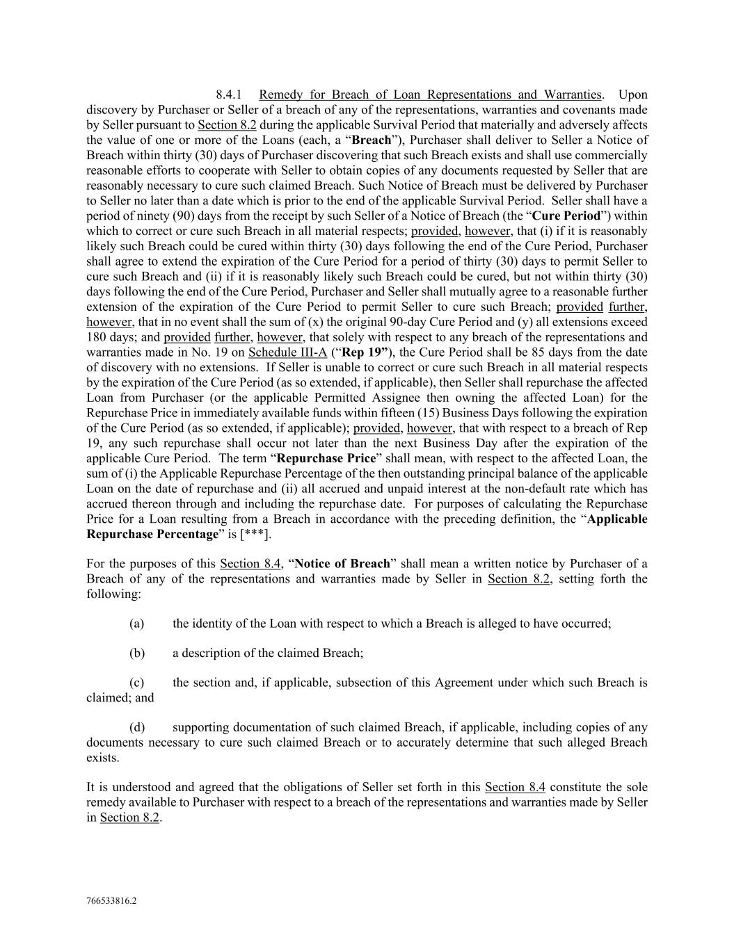 766533816.2 8.4.1 Remedy for Breach of Loan Representations and Warranties. Upon discovery by Purchaser or Seller of a breach of any of the representations, warranties and covenants made by Seller pursuant to Section 8.2 during the applicable Survival Period that materially and adversely affects the value of one or more of the Loans (each, a “Breach”), Purchaser shall deliver to Seller a Notice of Breach within thirty (30) days of Purchaser discovering that such Breach exists and shall use commercially reasonable efforts to cooperate with Seller to obtain copies of any documents requested by Seller that are reasonably necessary to cure such claimed Breach. Such Notice of Breach must be delivered by Purchaser to Seller no later than a date which is prior to the end of the applicable Survival Period. Seller shall have a period of ninety (90) days from the receipt by such Seller of a Notice of Breach (the “Cure Period”) within which to correct or cure such Breach in all material respects; provided, however, that (i) if it is reasonably likely such Breach could be cured within thirty (30) days following the end of the Cure Period, Purchaser shall agree to extend the expiration of the Cure Period for a period of thirty (30) days to permit Seller to cure such Breach and (ii) if it is reasonably likely such Breach could be cured, but not within thirty (30) days following the end of the Cure Period, Purchaser and Seller shall mutually agree to a reasonable further extension of the expiration of the Cure Period to permit Seller to cure such Breach; provided further, however, that in no event shall the sum of (x) the original 90-day Cure Period and (y) all extensions exceed 180 days; and provided further, however, that solely with respect to any breach of the representations and warranties made in No. 19 on Schedule III-A (“Rep 19”), the Cure Period shall be 85 days from the date of discovery with no extensions. If Seller is unable to correct or cure such Breach in all material respects by the expiration of the Cure Period (as so extended, if applicable), then Seller shall repurchase the affected Loan from Purchaser (or the applicable Permitted Assignee then owning the affected Loan) for the Repurchase Price in immediately available funds within fifteen (15) Business Days following the expiration of the Cure Period (as so extended, if applicable); provided, however, that with respect to a breach of Rep 19, any such repurchase shall occur not later than the next Business Day after the expiration of the applicable Cure Period. The term “Repurchase Price” shall mean, with respect to the affected Loan, the sum of (i) the Applicable Repurchase Percentage of the then outstanding principal balance of the applicable Loan on the date of repurchase and (ii) all accrued and unpaid interest at the non-default rate which has accrued thereon through and including the repurchase date. For purposes of calculating the Repurchase Price for a Loan resulting from a Breach in accordance with the preceding definition, the “Applicable Repurchase Percentage” is [***]. For the purposes of this Section 8.4, “Notice of Breach” shall mean a written notice by Purchaser of a Breach of any of the representations and warranties made by Seller in Section 8.2, setting forth the following: (a) the identity of the Loan with respect to which a Breach is alleged to have occurred; (b) a description of the claimed Breach; (c) the section and, if applicable, subsection of this Agreement under which such Breach is claimed; and (d) supporting documentation of such claimed Breach, if applicable, including copies of any documents necessary to cure such claimed Breach or to accurately determine that such alleged Breach exists. It is understood and agreed that the obligations of Seller set forth in this Section 8.4 constitute the sole remedy available to Purchaser with respect to a breach of the representations and warranties made by Seller in Section 8.2.