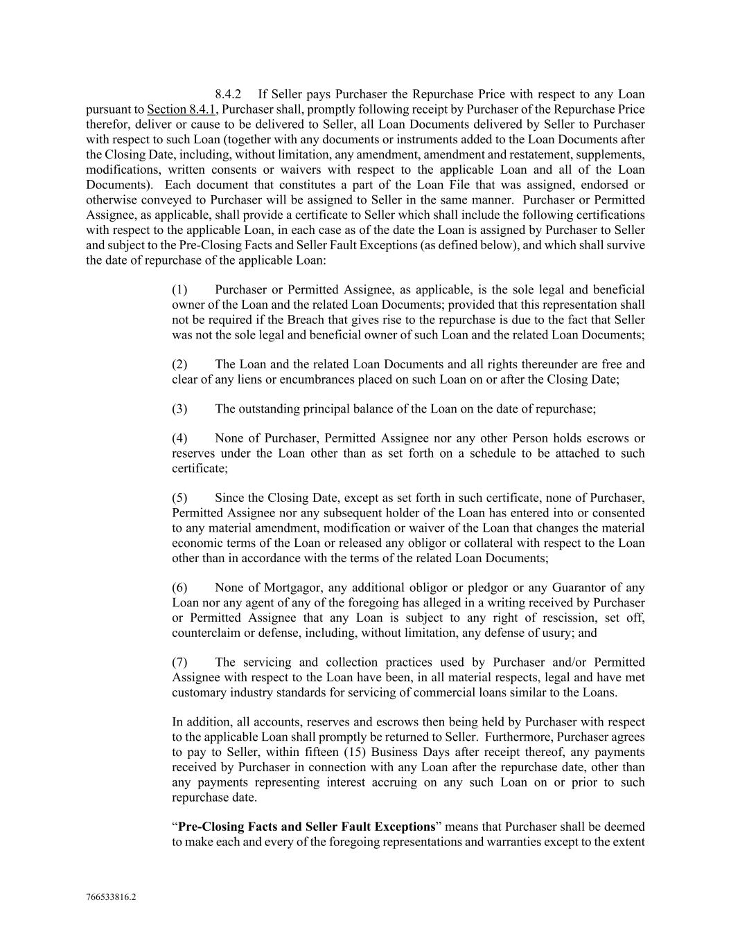 766533816.2 8.4.2 If Seller pays Purchaser the Repurchase Price with respect to any Loan pursuant to Section 8.4.1, Purchaser shall, promptly following receipt by Purchaser of the Repurchase Price therefor, deliver or cause to be delivered to Seller, all Loan Documents delivered by Seller to Purchaser with respect to such Loan (together with any documents or instruments added to the Loan Documents after the Closing Date, including, without limitation, any amendment, amendment and restatement, supplements, modifications, written consents or waivers with respect to the applicable Loan and all of the Loan Documents). Each document that constitutes a part of the Loan File that was assigned, endorsed or otherwise conveyed to Purchaser will be assigned to Seller in the same manner. Purchaser or Permitted Assignee, as applicable, shall provide a certificate to Seller which shall include the following certifications with respect to the applicable Loan, in each case as of the date the Loan is assigned by Purchaser to Seller and subject to the Pre-Closing Facts and Seller Fault Exceptions (as defined below), and which shall survive the date of repurchase of the applicable Loan: (1) Purchaser or Permitted Assignee, as applicable, is the sole legal and beneficial owner of the Loan and the related Loan Documents; provided that this representation shall not be required if the Breach that gives rise to the repurchase is due to the fact that Seller was not the sole legal and beneficial owner of such Loan and the related Loan Documents; (2) The Loan and the related Loan Documents and all rights thereunder are free and clear of any liens or encumbrances placed on such Loan on or after the Closing Date; (3) The outstanding principal balance of the Loan on the date of repurchase; (4) None of Purchaser, Permitted Assignee nor any other Person holds escrows or reserves under the Loan other than as set forth on a schedule to be attached to such certificate; (5) Since the Closing Date, except as set forth in such certificate, none of Purchaser, Permitted Assignee nor any subsequent holder of the Loan has entered into or consented to any material amendment, modification or waiver of the Loan that changes the material economic terms of the Loan or released any obligor or collateral with respect to the Loan other than in accordance with the terms of the related Loan Documents; (6) None of Mortgagor, any additional obligor or pledgor or any Guarantor of any Loan nor any agent of any of the foregoing has alleged in a writing received by Purchaser or Permitted Assignee that any Loan is subject to any right of rescission, set off, counterclaim or defense, including, without limitation, any defense of usury; and (7) The servicing and collection practices used by Purchaser and/or Permitted Assignee with respect to the Loan have been, in all material respects, legal and have met customary industry standards for servicing of commercial loans similar to the Loans. In addition, all accounts, reserves and escrows then being held by Purchaser with respect to the applicable Loan shall promptly be returned to Seller. Furthermore, Purchaser agrees to pay to Seller, within fifteen (15) Business Days after receipt thereof, any payments received by Purchaser in connection with any Loan after the repurchase date, other than any payments representing interest accruing on any such Loan on or prior to such repurchase date. “Pre-Closing Facts and Seller Fault Exceptions” means that Purchaser shall be deemed to make each and every of the foregoing representations and warranties except to the extent