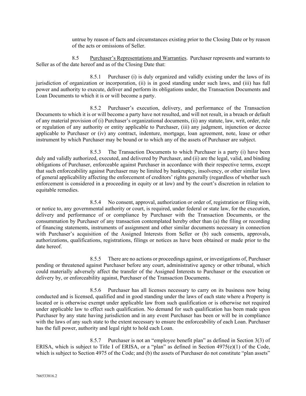 766533816.2 untrue by reason of facts and circumstances existing prior to the Closing Date or by reason of the acts or omissions of Seller. 8.5 Purchaser’s Representations and Warranties. Purchaser represents and warrants to Seller as of the date hereof and as of the Closing Date that: 8.5.1 Purchaser (i) is duly organized and validly existing under the laws of its jurisdiction of organization or incorporation, (ii) is in good standing under such laws, and (iii) has full power and authority to execute, deliver and perform its obligations under, the Transaction Documents and Loan Documents to which it is or will become a party. 8.5.2 Purchaser’s execution, delivery, and performance of the Transaction Documents to which it is or will become a party have not resulted, and will not result, in a breach or default of any material provision of (i) Purchaser’s organizational documents, (ii) any statute, law, writ, order, rule or regulation of any authority or entity applicable to Purchaser, (iii) any judgment, injunction or decree applicable to Purchaser or (iv) any contract, indenture, mortgage, loan agreement, note, lease or other instrument by which Purchaser may be bound or to which any of the assets of Purchaser are subject. 8.5.3 The Transaction Documents to which Purchaser is a party (i) have been duly and validly authorized, executed, and delivered by Purchaser, and (ii) are the legal, valid, and binding obligations of Purchaser, enforceable against Purchaser in accordance with their respective terms, except that such enforceability against Purchaser may be limited by bankruptcy, insolvency, or other similar laws of general applicability affecting the enforcement of creditors’ rights generally (regardless of whether such enforcement is considered in a proceeding in equity or at law) and by the court’s discretion in relation to equitable remedies. 8.5.4 No consent, approval, authorization or order of, registration or filing with, or notice to, any governmental authority or court, is required, under federal or state law, for the execution, delivery and performance of or compliance by Purchaser with the Transaction Documents, or the consummation by Purchaser of any transaction contemplated hereby other than (a) the filing or recording of financing statements, instruments of assignment and other similar documents necessary in connection with Purchaser’s acquisition of the Assigned Interests from Seller or (b) such consents, approvals, authorizations, qualifications, registrations, filings or notices as have been obtained or made prior to the date hereof. 8.5.5 There are no actions or proceedings against, or investigations of, Purchaser pending or threatened against Purchaser before any court, administrative agency or other tribunal, which could materially adversely affect the transfer of the Assigned Interests to Purchaser or the execution or delivery by, or enforceability against, Purchaser of the Transaction Documents. 8.5.6 Purchaser has all licenses necessary to carry on its business now being conducted and is licensed, qualified and in good standing under the laws of each state where a Property is located or is otherwise exempt under applicable law from such qualification or is otherwise not required under applicable law to effect such qualification. No demand for such qualification has been made upon Purchaser by any state having jurisdiction and in any event Purchaser has been or will be in compliance with the laws of any such state to the extent necessary to ensure the enforceability of each Loan. Purchaser has the full power, authority and legal right to hold each Loan. 8.5.7 Purchaser is not an “employee benefit plan” as defined in Section 3(3) of ERISA, which is subject to Title I of ERISA, or a “plan” as defined in Section 4975(e)(1) of the Code, which is subject to Section 4975 of the Code; and (b) the assets of Purchaser do not constitute “plan assets”
