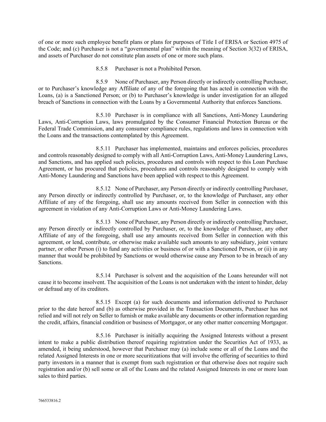 766533816.2 of one or more such employee benefit plans or plans for purposes of Title I of ERISA or Section 4975 of the Code; and (c) Purchaser is not a “governmental plan” within the meaning of Section 3(32) of ERISA, and assets of Purchaser do not constitute plan assets of one or more such plans. 8.5.8 Purchaser is not a Prohibited Person. 8.5.9 None of Purchaser, any Person directly or indirectly controlling Purchaser, or to Purchaser’s knowledge any Affiliate of any of the foregoing that has acted in connection with the Loans, (a) is a Sanctioned Person; or (b) to Purchaser’s knowledge is under investigation for an alleged breach of Sanctions in connection with the Loans by a Governmental Authority that enforces Sanctions. 8.5.10 Purchaser is in compliance with all Sanctions, Anti-Money Laundering Laws, Anti-Corruption Laws, laws promulgated by the Consumer Financial Protection Bureau or the Federal Trade Commission, and any consumer compliance rules, regulations and laws in connection with the Loans and the transactions contemplated by this Agreement. 8.5.11 Purchaser has implemented, maintains and enforces policies, procedures and controls reasonably designed to comply with all Anti-Corruption Laws, Anti-Money Laundering Laws, and Sanctions, and has applied such policies, procedures and controls with respect to this Loan Purchase Agreement, or has procured that policies, procedures and controls reasonably designed to comply with Anti-Money Laundering and Sanctions have been applied with respect to this Agreement. 8.5.12 None of Purchaser, any Person directly or indirectly controlling Purchaser, any Person directly or indirectly controlled by Purchaser, or, to the knowledge of Purchaser, any other Affiliate of any of the foregoing, shall use any amounts received from Seller in connection with this agreement in violation of any Anti-Corruption Laws or Anti-Money Laundering Laws. 8.5.13 None of Purchaser, any Person directly or indirectly controlling Purchaser, any Person directly or indirectly controlled by Purchaser, or, to the knowledge of Purchaser, any other Affiliate of any of the foregoing, shall use any amounts received from Seller in connection with this agreement, or lend, contribute, or otherwise make available such amounts to any subsidiary, joint venture partner, or other Person (i) to fund any activities or business of or with a Sanctioned Person, or (ii) in any manner that would be prohibited by Sanctions or would otherwise cause any Person to be in breach of any Sanctions. 8.5.14 Purchaser is solvent and the acquisition of the Loans hereunder will not cause it to become insolvent. The acquisition of the Loans is not undertaken with the intent to hinder, delay or defraud any of its creditors. 8.5.15 Except (a) for such documents and information delivered to Purchaser prior to the date hereof and (b) as otherwise provided in the Transaction Documents, Purchaser has not relied and will not rely on Seller to furnish or make available any documents or other information regarding the credit, affairs, financial condition or business of Mortgagor, or any other matter concerning Mortgagor. 8.5.16 Purchaser is initially acquiring the Assigned Interests without a present intent to make a public distribution thereof requiring registration under the Securities Act of 1933, as amended, it being understood, however that Purchaser may (a) include some or all of the Loans and the related Assigned Interests in one or more securitizations that will involve the offering of securities to third party investors in a manner that is exempt from such registration or that otherwise does not require such registration and/or (b) sell some or all of the Loans and the related Assigned Interests in one or more loan sales to third parties.