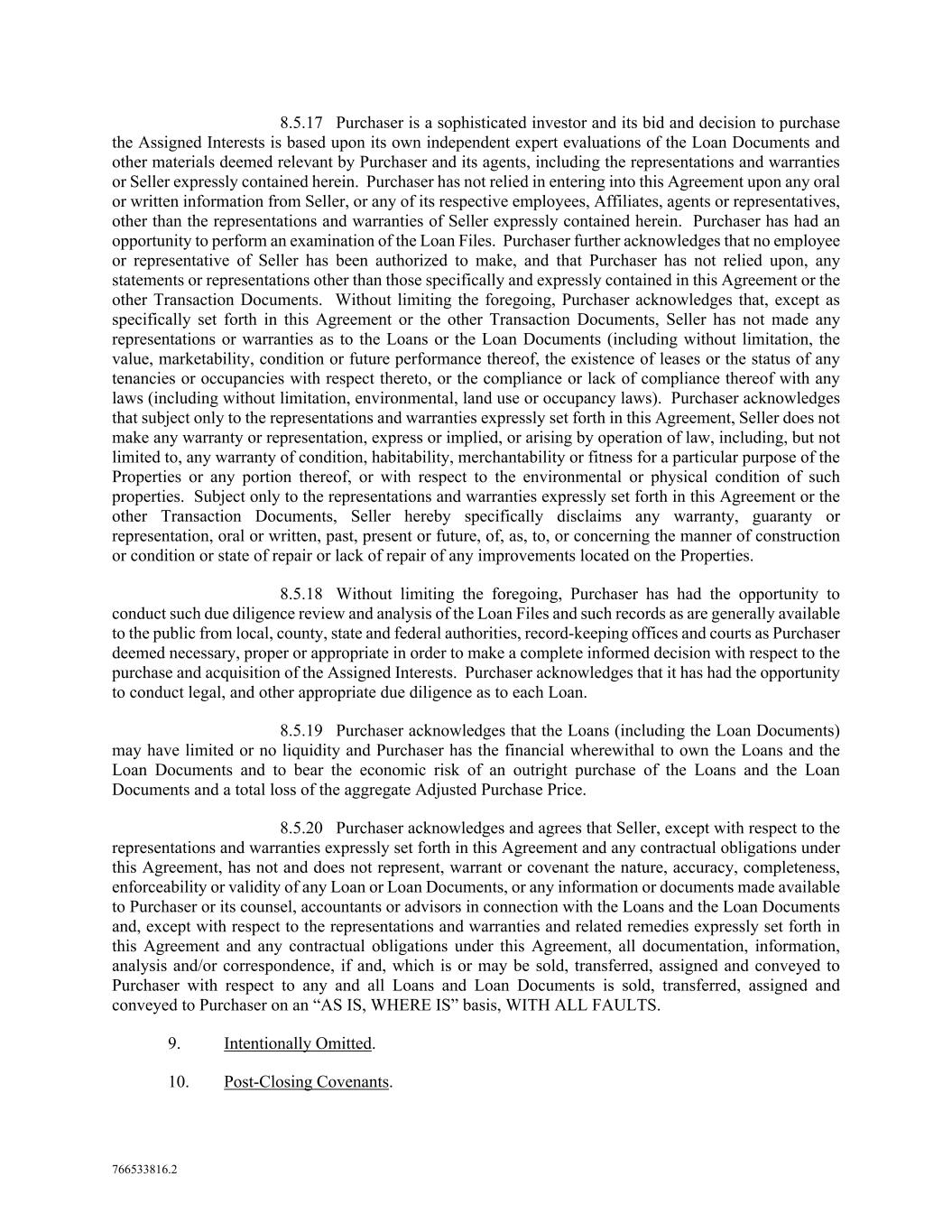 766533816.2 8.5.17 Purchaser is a sophisticated investor and its bid and decision to purchase the Assigned Interests is based upon its own independent expert evaluations of the Loan Documents and other materials deemed relevant by Purchaser and its agents, including the representations and warranties or Seller expressly contained herein. Purchaser has not relied in entering into this Agreement upon any oral or written information from Seller, or any of its respective employees, Affiliates, agents or representatives, other than the representations and warranties of Seller expressly contained herein. Purchaser has had an opportunity to perform an examination of the Loan Files. Purchaser further acknowledges that no employee or representative of Seller has been authorized to make, and that Purchaser has not relied upon, any statements or representations other than those specifically and expressly contained in this Agreement or the other Transaction Documents. Without limiting the foregoing, Purchaser acknowledges that, except as specifically set forth in this Agreement or the other Transaction Documents, Seller has not made any representations or warranties as to the Loans or the Loan Documents (including without limitation, the value, marketability, condition or future performance thereof, the existence of leases or the status of any tenancies or occupancies with respect thereto, or the compliance or lack of compliance thereof with any laws (including without limitation, environmental, land use or occupancy laws). Purchaser acknowledges that subject only to the representations and warranties expressly set forth in this Agreement, Seller does not make any warranty or representation, express or implied, or arising by operation of law, including, but not limited to, any warranty of condition, habitability, merchantability or fitness for a particular purpose of the Properties or any portion thereof, or with respect to the environmental or physical condition of such properties. Subject only to the representations and warranties expressly set forth in this Agreement or the other Transaction Documents, Seller hereby specifically disclaims any warranty, guaranty or representation, oral or written, past, present or future, of, as, to, or concerning the manner of construction or condition or state of repair or lack of repair of any improvements located on the Properties. 8.5.18 Without limiting the foregoing, Purchaser has had the opportunity to conduct such due diligence review and analysis of the Loan Files and such records as are generally available to the public from local, county, state and federal authorities, record-keeping offices and courts as Purchaser deemed necessary, proper or appropriate in order to make a complete informed decision with respect to the purchase and acquisition of the Assigned Interests. Purchaser acknowledges that it has had the opportunity to conduct legal, and other appropriate due diligence as to each Loan. 8.5.19 Purchaser acknowledges that the Loans (including the Loan Documents) may have limited or no liquidity and Purchaser has the financial wherewithal to own the Loans and the Loan Documents and to bear the economic risk of an outright purchase of the Loans and the Loan Documents and a total loss of the aggregate Adjusted Purchase Price. 8.5.20 Purchaser acknowledges and agrees that Seller, except with respect to the representations and warranties expressly set forth in this Agreement and any contractual obligations under this Agreement, has not and does not represent, warrant or covenant the nature, accuracy, completeness, enforceability or validity of any Loan or Loan Documents, or any information or documents made available to Purchaser or its counsel, accountants or advisors in connection with the Loans and the Loan Documents and, except with respect to the representations and warranties and related remedies expressly set forth in this Agreement and any contractual obligations under this Agreement, all documentation, information, analysis and/or correspondence, if and, which is or may be sold, transferred, assigned and conveyed to Purchaser with respect to any and all Loans and Loan Documents is sold, transferred, assigned and conveyed to Purchaser on an “AS IS, WHERE IS” basis, WITH ALL FAULTS. 9. Intentionally Omitted. 10. Post-Closing Covenants.