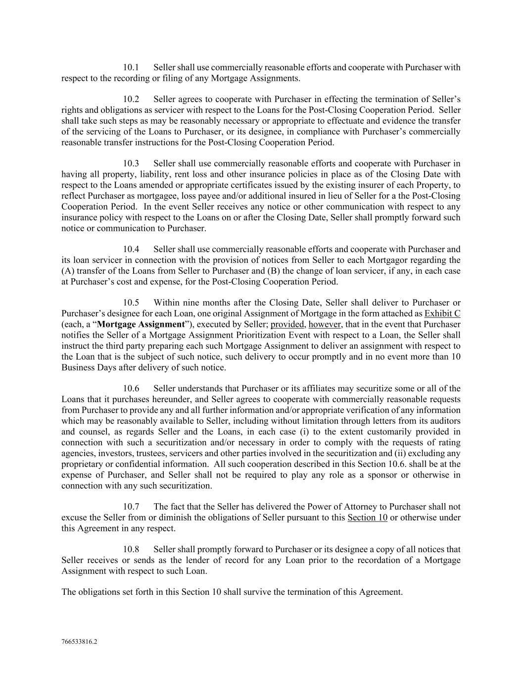 766533816.2 10.1 Seller shall use commercially reasonable efforts and cooperate with Purchaser with respect to the recording or filing of any Mortgage Assignments. 10.2 Seller agrees to cooperate with Purchaser in effecting the termination of Seller’s rights and obligations as servicer with respect to the Loans for the Post-Closing Cooperation Period. Seller shall take such steps as may be reasonably necessary or appropriate to effectuate and evidence the transfer of the servicing of the Loans to Purchaser, or its designee, in compliance with Purchaser’s commercially reasonable transfer instructions for the Post-Closing Cooperation Period. 10.3 Seller shall use commercially reasonable efforts and cooperate with Purchaser in having all property, liability, rent loss and other insurance policies in place as of the Closing Date with respect to the Loans amended or appropriate certificates issued by the existing insurer of each Property, to reflect Purchaser as mortgagee, loss payee and/or additional insured in lieu of Seller for a the Post-Closing Cooperation Period. In the event Seller receives any notice or other communication with respect to any insurance policy with respect to the Loans on or after the Closing Date, Seller shall promptly forward such notice or communication to Purchaser. 10.4 Seller shall use commercially reasonable efforts and cooperate with Purchaser and its loan servicer in connection with the provision of notices from Seller to each Mortgagor regarding the (A) transfer of the Loans from Seller to Purchaser and (B) the change of loan servicer, if any, in each case at Purchaser’s cost and expense, for the Post-Closing Cooperation Period. 10.5 Within nine months after the Closing Date, Seller shall deliver to Purchaser or Purchaser’s designee for each Loan, one original Assignment of Mortgage in the form attached as Exhibit C (each, a “Mortgage Assignment”), executed by Seller; provided, however, that in the event that Purchaser notifies the Seller of a Mortgage Assignment Prioritization Event with respect to a Loan, the Seller shall instruct the third party preparing each such Mortgage Assignment to deliver an assignment with respect to the Loan that is the subject of such notice, such delivery to occur promptly and in no event more than 10 Business Days after delivery of such notice. 10.6 Seller understands that Purchaser or its affiliates may securitize some or all of the Loans that it purchases hereunder, and Seller agrees to cooperate with commercially reasonable requests from Purchaser to provide any and all further information and/or appropriate verification of any information which may be reasonably available to Seller, including without limitation through letters from its auditors and counsel, as regards Seller and the Loans, in each case (i) to the extent customarily provided in connection with such a securitization and/or necessary in order to comply with the requests of rating agencies, investors, trustees, servicers and other parties involved in the securitization and (ii) excluding any proprietary or confidential information. All such cooperation described in this Section 10.6. shall be at the expense of Purchaser, and Seller shall not be required to play any role as a sponsor or otherwise in connection with any such securitization. 10.7 The fact that the Seller has delivered the Power of Attorney to Purchaser shall not excuse the Seller from or diminish the obligations of Seller pursuant to this Section 10 or otherwise under this Agreement in any respect. 10.8 Seller shall promptly forward to Purchaser or its designee a copy of all notices that Seller receives or sends as the lender of record for any Loan prior to the recordation of a Mortgage Assignment with respect to such Loan. The obligations set forth in this Section 10 shall survive the termination of this Agreement.