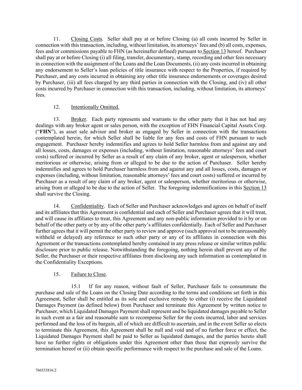 766533816.2 11. Closing Costs. Seller shall pay at or before Closing (a) all costs incurred by Seller in connection with this transaction, including, without limitation, its attorneys’ fees and (b) all costs, expenses, fees and/or commissions payable to FHN (as hereinafter defined) pursuant to Section 13 hereof. Purchaser shall pay at or before Closing (i) all filing, transfer, documentary, stamp, recording and other fees necessary in connection with the assignment of the Loans and the Loan Documents, (ii) any costs incurred in obtaining any endorsement to Seller’s loan policies of title insurance with respect to the Properties, if required by Purchaser, and any costs incurred in obtaining any other title insurance endorsements or coverages desired by Purchaser, (iii) all fees charged by any third parties in connection with the Closing, and (iv) all other costs incurred by Purchaser in connection with this transaction, including, without limitation, its attorneys’ fees. 12. Intentionally Omitted. 13. Broker. Each party represents and warrants to the other party that it has not had any dealings with any broker agent or sales person, with the exception of FHN Financial Capital Assets Corp. (“FHN”), as asset sale advisor and broker as engaged by Seller in connection with the transactions contemplated herein, for which Seller shall be liable for any fees and costs of FHN pursuant to such engagement. Purchaser hereby indemnifies and agrees to hold Seller harmless from and against any and all losses, costs, damages or expenses (including, without limitation, reasonable attorneys’ fees and court costs) suffered or incurred by Seller as a result of any claim of any broker, agent or salesperson, whether meritorious or otherwise, arising from or alleged to be due to the action of Purchaser. Seller hereby indemnifies and agrees to hold Purchaser harmless from and against any and all losses, costs, damages or expenses (including, without limitation, reasonable attorneys’ fees and court costs) suffered or incurred by Purchaser as a result of any claim of any broker, agent or salesperson, whether meritorious or otherwise, arising from or alleged to be due to the action of Seller. The foregoing indemnifications in this Section 13 shall survive the Closing. 14. Confidentiality. Each of Seller and Purchaser acknowledges and agrees on behalf of itself and its affiliates that this Agreement is confidential and each of Seller and Purchaser agrees that it will treat, and will cause its affiliates to treat, this Agreement and any non-public information provided to it by or on behalf of the other party or by any of the other party’s affiliates confidentially. Each of Seller and Purchaser further agrees that it will permit the other party to review and approve (such approval not to be unreasonably withheld or delayed) any reference to such other party or any of its affiliates in connection with this Agreement or the transactions contemplated hereby contained in any press release or similar written public disclosure prior to public release. Notwithstanding the foregoing, nothing herein shall prevent any of the Seller, the Purchaser or their respective affiliates from disclosing any such information as contemplated in the Confidentiality Exceptions. 15. Failure to Close. 15.1 If for any reason, without fault of Seller, Purchaser fails to consummate the purchase and sale of the Loans on the Closing Date according to the terms and conditions set forth in this Agreement, Seller shall be entitled as its sole and exclusive remedy to either (i) receive the Liquidated Damages Payment (as defined below) from Purchaser and terminate this Agreement by written notice to Purchaser, which Liquidated Damages Payment shall represent and be liquidated damages payable to Seller in such event as a fair and reasonable sum to recompense Seller for the costs incurred, labor and services performed and the loss of its bargain, all of which are difficult to ascertain, and in the event Seller so elects to terminate this Agreement, this Agreement shall be null and void and of no further force or effect, the Liquidated Damages Payment shall be paid to Seller as liquidated damages, and the parties hereto shall have no further rights or obligations under this Agreement other than those that expressly survive the termination hereof or (ii) obtain specific performance with respect to the purchase and sale of the Loans.