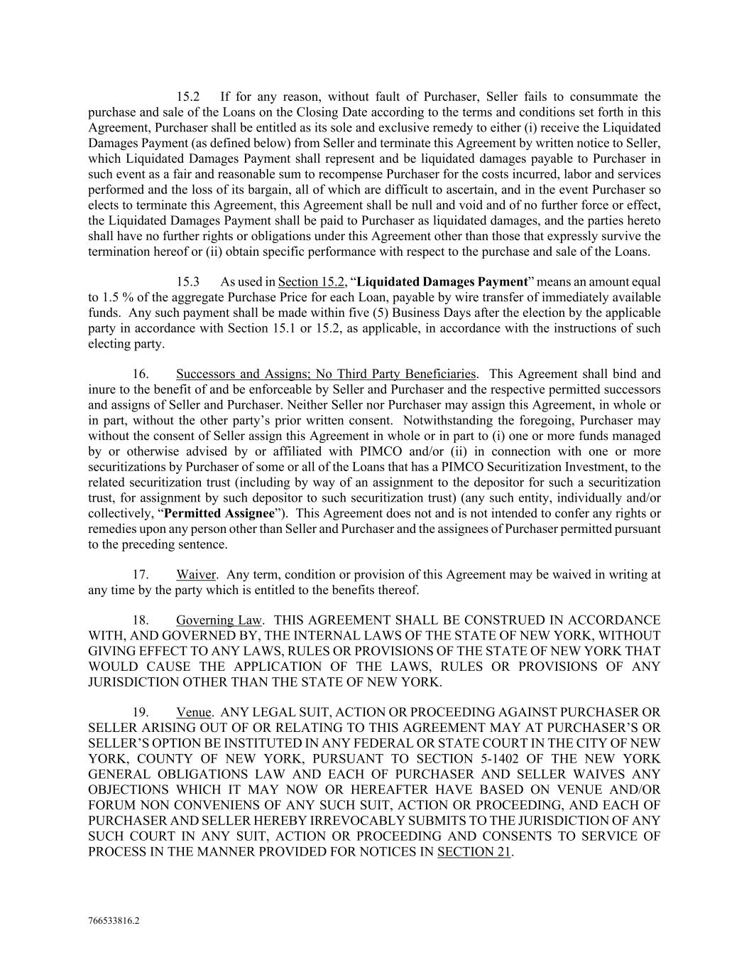 766533816.2 15.2 If for any reason, without fault of Purchaser, Seller fails to consummate the purchase and sale of the Loans on the Closing Date according to the terms and conditions set forth in this Agreement, Purchaser shall be entitled as its sole and exclusive remedy to either (i) receive the Liquidated Damages Payment (as defined below) from Seller and terminate this Agreement by written notice to Seller, which Liquidated Damages Payment shall represent and be liquidated damages payable to Purchaser in such event as a fair and reasonable sum to recompense Purchaser for the costs incurred, labor and services performed and the loss of its bargain, all of which are difficult to ascertain, and in the event Purchaser so elects to terminate this Agreement, this Agreement shall be null and void and of no further force or effect, the Liquidated Damages Payment shall be paid to Purchaser as liquidated damages, and the parties hereto shall have no further rights or obligations under this Agreement other than those that expressly survive the termination hereof or (ii) obtain specific performance with respect to the purchase and sale of the Loans. 15.3 As used in Section 15.2, “Liquidated Damages Payment” means an amount equal to 1.5 % of the aggregate Purchase Price for each Loan, payable by wire transfer of immediately available funds. Any such payment shall be made within five (5) Business Days after the election by the applicable party in accordance with Section 15.1 or 15.2, as applicable, in accordance with the instructions of such electing party. 16. Successors and Assigns; No Third Party Beneficiaries. This Agreement shall bind and inure to the benefit of and be enforceable by Seller and Purchaser and the respective permitted successors and assigns of Seller and Purchaser. Neither Seller nor Purchaser may assign this Agreement, in whole or in part, without the other party’s prior written consent. Notwithstanding the foregoing, Purchaser may without the consent of Seller assign this Agreement in whole or in part to (i) one or more funds managed by or otherwise advised by or affiliated with PIMCO and/or (ii) in connection with one or more securitizations by Purchaser of some or all of the Loans that has a PIMCO Securitization Investment, to the related securitization trust (including by way of an assignment to the depositor for such a securitization trust, for assignment by such depositor to such securitization trust) (any such entity, individually and/or collectively, “Permitted Assignee”). This Agreement does not and is not intended to confer any rights or remedies upon any person other than Seller and Purchaser and the assignees of Purchaser permitted pursuant to the preceding sentence. 17. Waiver. Any term, condition or provision of this Agreement may be waived in writing at any time by the party which is entitled to the benefits thereof. 18. Governing Law. THIS AGREEMENT SHALL BE CONSTRUED IN ACCORDANCE WITH, AND GOVERNED BY, THE INTERNAL LAWS OF THE STATE OF NEW YORK, WITHOUT GIVING EFFECT TO ANY LAWS, RULES OR PROVISIONS OF THE STATE OF NEW YORK THAT WOULD CAUSE THE APPLICATION OF THE LAWS, RULES OR PROVISIONS OF ANY JURISDICTION OTHER THAN THE STATE OF NEW YORK. 19. Venue. ANY LEGAL SUIT, ACTION OR PROCEEDING AGAINST PURCHASER OR SELLER ARISING OUT OF OR RELATING TO THIS AGREEMENT MAY AT PURCHASER’S OR SELLER’S OPTION BE INSTITUTED IN ANY FEDERAL OR STATE COURT IN THE CITY OF NEW YORK, COUNTY OF NEW YORK, PURSUANT TO SECTION 5-1402 OF THE NEW YORK GENERAL OBLIGATIONS LAW AND EACH OF PURCHASER AND SELLER WAIVES ANY OBJECTIONS WHICH IT MAY NOW OR HEREAFTER HAVE BASED ON VENUE AND/OR FORUM NON CONVENIENS OF ANY SUCH SUIT, ACTION OR PROCEEDING, AND EACH OF PURCHASER AND SELLER HEREBY IRREVOCABLY SUBMITS TO THE JURISDICTION OF ANY SUCH COURT IN ANY SUIT, ACTION OR PROCEEDING AND CONSENTS TO SERVICE OF PROCESS IN THE MANNER PROVIDED FOR NOTICES IN SECTION 21.