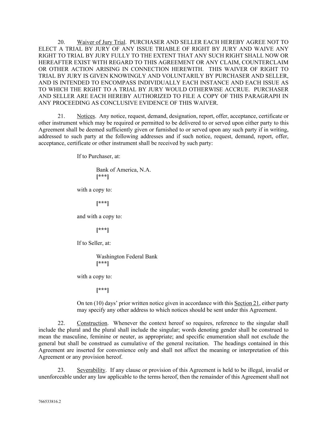 766533816.2 20. Waiver of Jury Trial. PURCHASER AND SELLER EACH HEREBY AGREE NOT TO ELECT A TRIAL BY JURY OF ANY ISSUE TRIABLE OF RIGHT BY JURY AND WAIVE ANY RIGHT TO TRIAL BY JURY FULLY TO THE EXTENT THAT ANY SUCH RIGHT SHALL NOW OR HEREAFTER EXIST WITH REGARD TO THIS AGREEMENT OR ANY CLAIM, COUNTERCLAIM OR OTHER ACTION ARISING IN CONNECTION HEREWITH. THIS WAIVER OF RIGHT TO TRIAL BY JURY IS GIVEN KNOWINGLY AND VOLUNTARILY BY PURCHASER AND SELLER, AND IS INTENDED TO ENCOMPASS INDIVIDUALLY EACH INSTANCE AND EACH ISSUE AS TO WHICH THE RIGHT TO A TRIAL BY JURY WOULD OTHERWISE ACCRUE. PURCHASER AND SELLER ARE EACH HEREBY AUTHORIZED TO FILE A COPY OF THIS PARAGRAPH IN ANY PROCEEDING AS CONCLUSIVE EVIDENCE OF THIS WAIVER. 21. Notices. Any notice, request, demand, designation, report, offer, acceptance, certificate or other instrument which may be required or permitted to be delivered to or served upon either party to this Agreement shall be deemed sufficiently given or furnished to or served upon any such party if in writing, addressed to such party at the following addresses and if such notice, request, demand, report, offer, acceptance, certificate or other instrument shall be received by such party: If to Purchaser, at: Bank of America, N.A. [***] with a copy to: [***] and with a copy to: [***] If to Seller, at: Washington Federal Bank [***] with a copy to: [***] On ten (10) days’ prior written notice given in accordance with this Section 21, either party may specify any other address to which notices should be sent under this Agreement. 22. Construction. Whenever the context hereof so requires, reference to the singular shall include the plural and the plural shall include the singular; words denoting gender shall be construed to mean the masculine, feminine or neuter, as appropriate; and specific enumeration shall not exclude the general but shall be construed as cumulative of the general recitation. The headings contained in this Agreement are inserted for convenience only and shall not affect the meaning or interpretation of this Agreement or any provision hereof. 23. Severability. If any clause or provision of this Agreement is held to be illegal, invalid or unenforceable under any law applicable to the terms hereof, then the remainder of this Agreement shall not