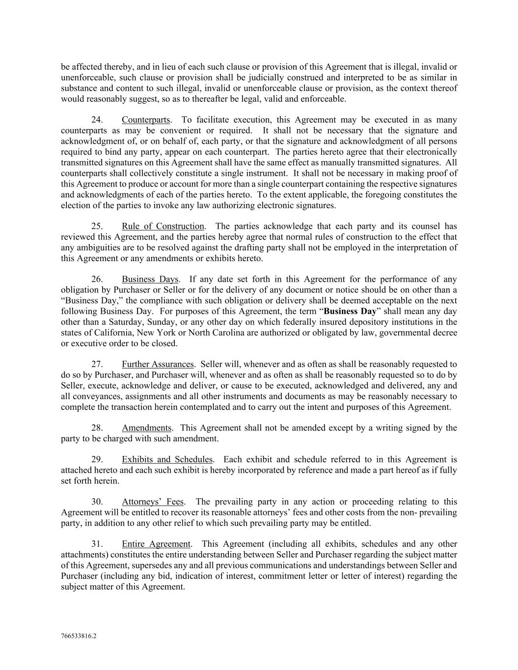 766533816.2 be affected thereby, and in lieu of each such clause or provision of this Agreement that is illegal, invalid or unenforceable, such clause or provision shall be judicially construed and interpreted to be as similar in substance and content to such illegal, invalid or unenforceable clause or provision, as the context thereof would reasonably suggest, so as to thereafter be legal, valid and enforceable. 24. Counterparts. To facilitate execution, this Agreement may be executed in as many counterparts as may be convenient or required. It shall not be necessary that the signature and acknowledgment of, or on behalf of, each party, or that the signature and acknowledgment of all persons required to bind any party, appear on each counterpart. The parties hereto agree that their electronically transmitted signatures on this Agreement shall have the same effect as manually transmitted signatures. All counterparts shall collectively constitute a single instrument. It shall not be necessary in making proof of this Agreement to produce or account for more than a single counterpart containing the respective signatures and acknowledgments of each of the parties hereto. To the extent applicable, the foregoing constitutes the election of the parties to invoke any law authorizing electronic signatures. 25. Rule of Construction. The parties acknowledge that each party and its counsel has reviewed this Agreement, and the parties hereby agree that normal rules of construction to the effect that any ambiguities are to be resolved against the drafting party shall not be employed in the interpretation of this Agreement or any amendments or exhibits hereto. 26. Business Days. If any date set forth in this Agreement for the performance of any obligation by Purchaser or Seller or for the delivery of any document or notice should be on other than a “Business Day,” the compliance with such obligation or delivery shall be deemed acceptable on the next following Business Day. For purposes of this Agreement, the term “Business Day” shall mean any day other than a Saturday, Sunday, or any other day on which federally insured depository institutions in the states of California, New York or North Carolina are authorized or obligated by law, governmental decree or executive order to be closed. 27. Further Assurances. Seller will, whenever and as often as shall be reasonably requested to do so by Purchaser, and Purchaser will, whenever and as often as shall be reasonably requested so to do by Seller, execute, acknowledge and deliver, or cause to be executed, acknowledged and delivered, any and all conveyances, assignments and all other instruments and documents as may be reasonably necessary to complete the transaction herein contemplated and to carry out the intent and purposes of this Agreement. 28. Amendments. This Agreement shall not be amended except by a writing signed by the party to be charged with such amendment. 29. Exhibits and Schedules. Each exhibit and schedule referred to in this Agreement is attached hereto and each such exhibit is hereby incorporated by reference and made a part hereof as if fully set forth herein. 30. Attorneys’ Fees. The prevailing party in any action or proceeding relating to this Agreement will be entitled to recover its reasonable attorneys’ fees and other costs from the non- prevailing party, in addition to any other relief to which such prevailing party may be entitled. 31. Entire Agreement. This Agreement (including all exhibits, schedules and any other attachments) constitutes the entire understanding between Seller and Purchaser regarding the subject matter of this Agreement, supersedes any and all previous communications and understandings between Seller and Purchaser (including any bid, indication of interest, commitment letter or letter of interest) regarding the subject matter of this Agreement.