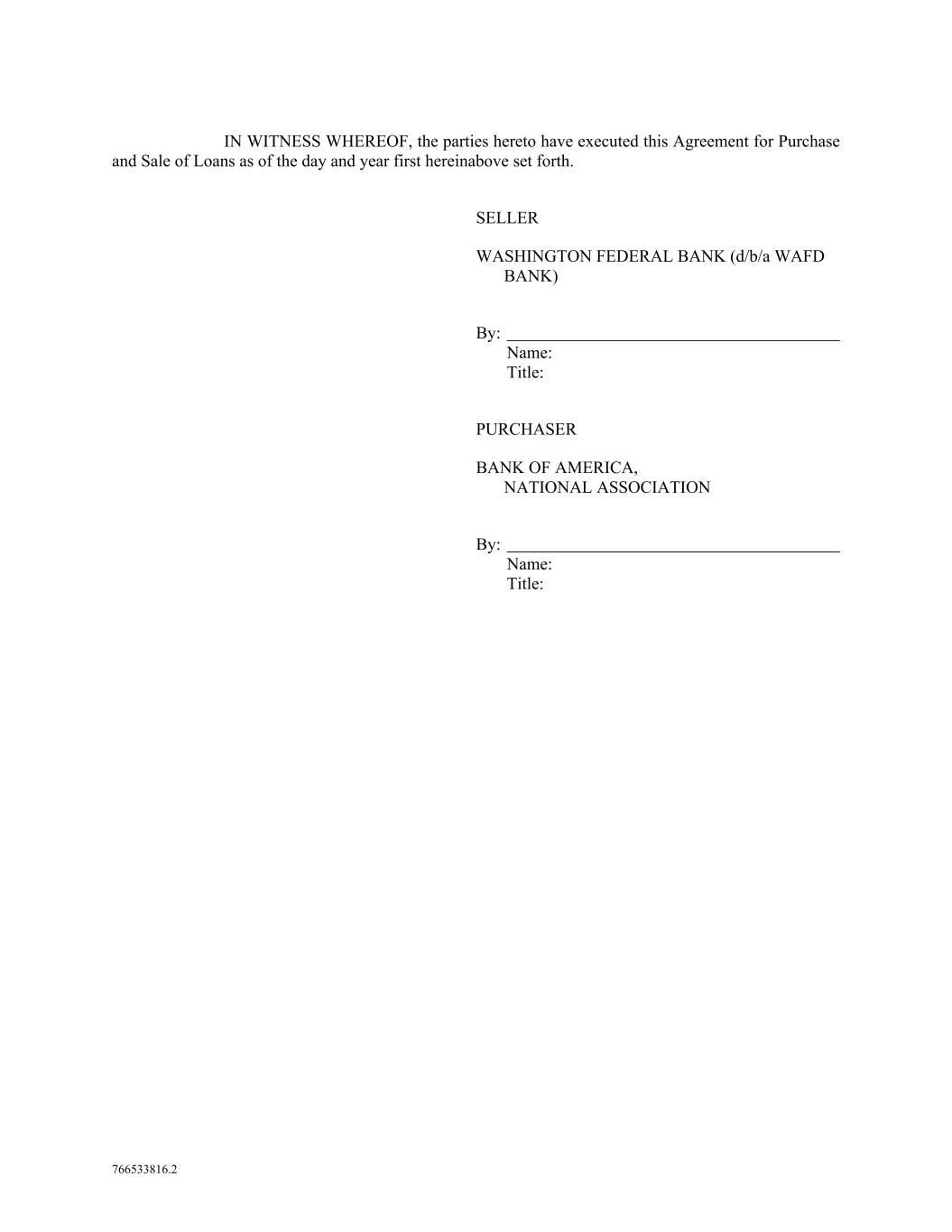 766533816.2 IN WITNESS WHEREOF, the parties hereto have executed this Agreement for Purchase and Sale of Loans as of the day and year first hereinabove set forth. SELLER WASHINGTON FEDERAL BANK (d/b/a WAFD BANK) By: Name: Title: PURCHASER BANK OF AMERICA, NATIONAL ASSOCIATION By: Name: Title: