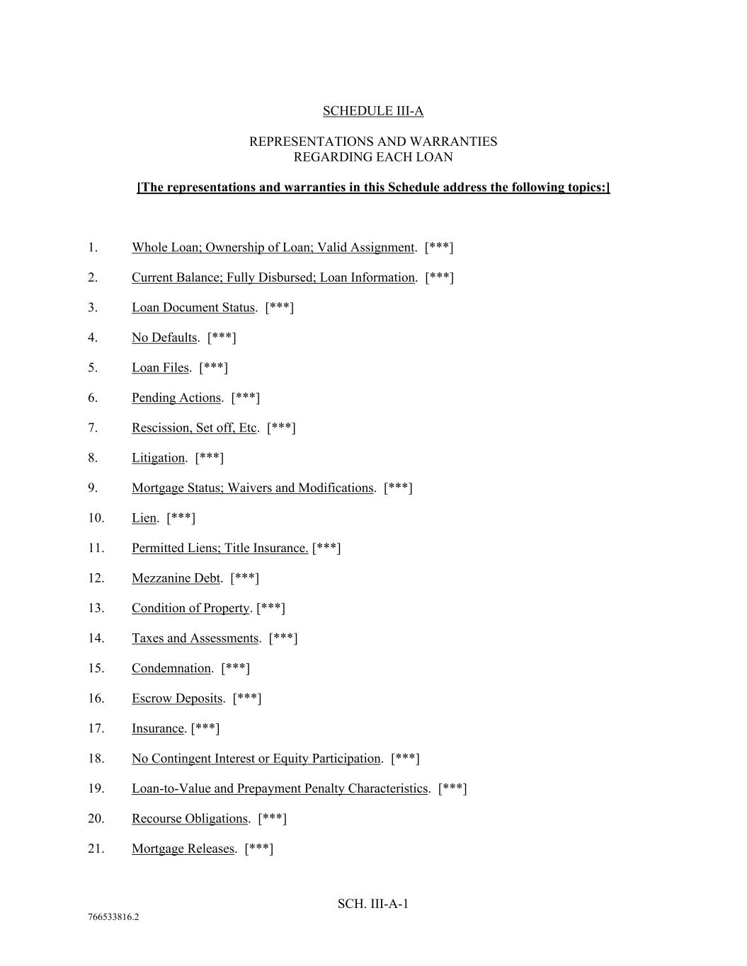 SCH. III-A-1 766533816.2 SCHEDULE III-A REPRESENTATIONS AND WARRANTIES REGARDING EACH LOAN [The representations and warranties in this Schedule address the following topics:] 1. Whole Loan; Ownership of Loan; Valid Assignment. [***] 2. Current Balance; Fully Disbursed; Loan Information. [***] 3. Loan Document Status. [***] 4. No Defaults. [***] 5. Loan Files. [***] 6. Pending Actions. [***] 7. Rescission, Set off, Etc. [***] 8. Litigation. [***] 9. Mortgage Status; Waivers and Modifications. [***] 10. Lien. [***] 11. Permitted Liens; Title Insurance. [***] 12. Mezzanine Debt. [***] 13. Condition of Property. [***] 14. Taxes and Assessments. [***] 15. Condemnation. [***] 16. Escrow Deposits. [***] 17. Insurance. [***] 18. No Contingent Interest or Equity Participation. [***] 19. Loan-to-Value and Prepayment Penalty Characteristics. [***] 20. Recourse Obligations. [***] 21. Mortgage Releases. [***]