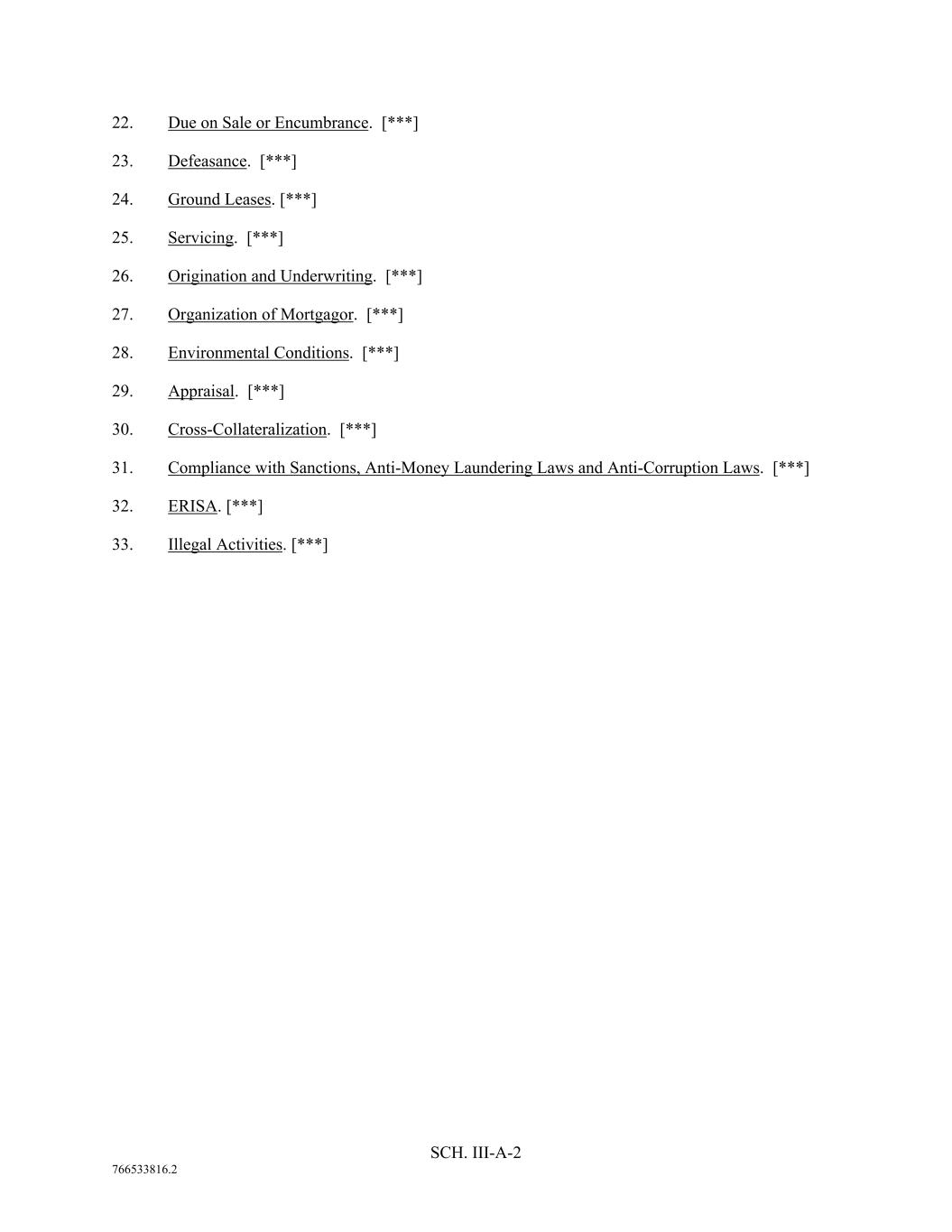 SCH. III-A-2 766533816.2 22. Due on Sale or Encumbrance. [***] 23. Defeasance. [***] 24. Ground Leases. [***] 25. Servicing. [***] 26. Origination and Underwriting. [***] 27. Organization of Mortgagor. [***] 28. Environmental Conditions. [***] 29. Appraisal. [***] 30. Cross-Collateralization. [***] 31. Compliance with Sanctions, Anti-Money Laundering Laws and Anti-Corruption Laws. [***] 32. ERISA. [***] 33. Illegal Activities. [***]