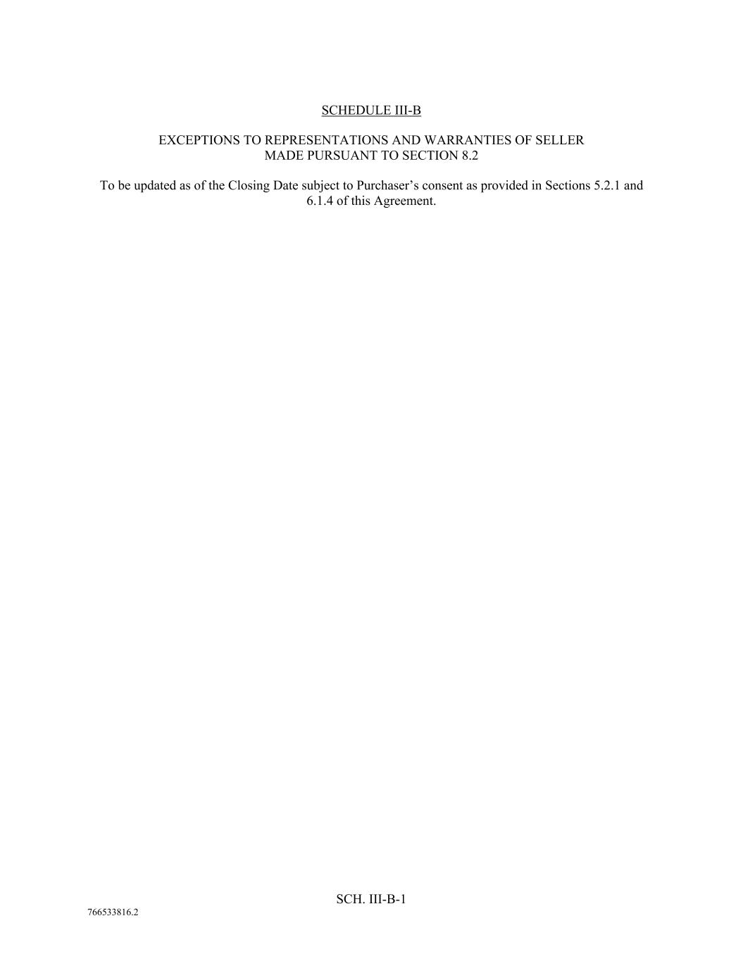 SCH. III-B-1 766533816.2 SCHEDULE III-B EXCEPTIONS TO REPRESENTATIONS AND WARRANTIES OF SELLER MADE PURSUANT TO SECTION 8.2 To be updated as of the Closing Date subject to Purchaser’s consent as provided in Sections 5.2.1 and 6.1.4 of this Agreement.