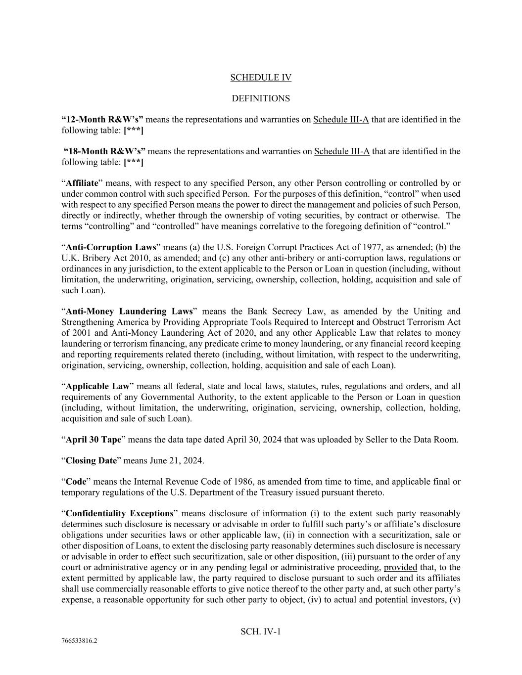 SCH. IV-1 766533816.2 SCHEDULE IV DEFINITIONS “12-Month R&W’s” means the representations and warranties on Schedule III-A that are identified in the following table: [***] “18-Month R&W’s” means the representations and warranties on Schedule III-A that are identified in the following table: [***] “Affiliate” means, with respect to any specified Person, any other Person controlling or controlled by or under common control with such specified Person. For the purposes of this definition, “control” when used with respect to any specified Person means the power to direct the management and policies of such Person, directly or indirectly, whether through the ownership of voting securities, by contract or otherwise. The terms “controlling” and “controlled” have meanings correlative to the foregoing definition of “control.” “Anti-Corruption Laws” means (a) the U.S. Foreign Corrupt Practices Act of 1977, as amended; (b) the U.K. Bribery Act 2010, as amended; and (c) any other anti-bribery or anti-corruption laws, regulations or ordinances in any jurisdiction, to the extent applicable to the Person or Loan in question (including, without limitation, the underwriting, origination, servicing, ownership, collection, holding, acquisition and sale of such Loan). “Anti-Money Laundering Laws” means the Bank Secrecy Law, as amended by the Uniting and Strengthening America by Providing Appropriate Tools Required to Intercept and Obstruct Terrorism Act of 2001 and Anti-Money Laundering Act of 2020, and any other Applicable Law that relates to money laundering or terrorism financing, any predicate crime to money laundering, or any financial record keeping and reporting requirements related thereto (including, without limitation, with respect to the underwriting, origination, servicing, ownership, collection, holding, acquisition and sale of each Loan). “Applicable Law” means all federal, state and local laws, statutes, rules, regulations and orders, and all requirements of any Governmental Authority, to the extent applicable to the Person or Loan in question (including, without limitation, the underwriting, origination, servicing, ownership, collection, holding, acquisition and sale of such Loan). “April 30 Tape” means the data tape dated April 30, 2024 that was uploaded by Seller to the Data Room. “Closing Date” means June 21, 2024. “Code” means the Internal Revenue Code of 1986, as amended from time to time, and applicable final or temporary regulations of the U.S. Department of the Treasury issued pursuant thereto. “Confidentiality Exceptions” means disclosure of information (i) to the extent such party reasonably determines such disclosure is necessary or advisable in order to fulfill such party’s or affiliate’s disclosure obligations under securities laws or other applicable law, (ii) in connection with a securitization, sale or other disposition of Loans, to extent the disclosing party reasonably determines such disclosure is necessary or advisable in order to effect such securitization, sale or other disposition, (iii) pursuant to the order of any court or administrative agency or in any pending legal or administrative proceeding, provided that, to the extent permitted by applicable law, the party required to disclose pursuant to such order and its affiliates shall use commercially reasonable efforts to give notice thereof to the other party and, at such other party’s expense, a reasonable opportunity for such other party to object, (iv) to actual and potential investors, (v)