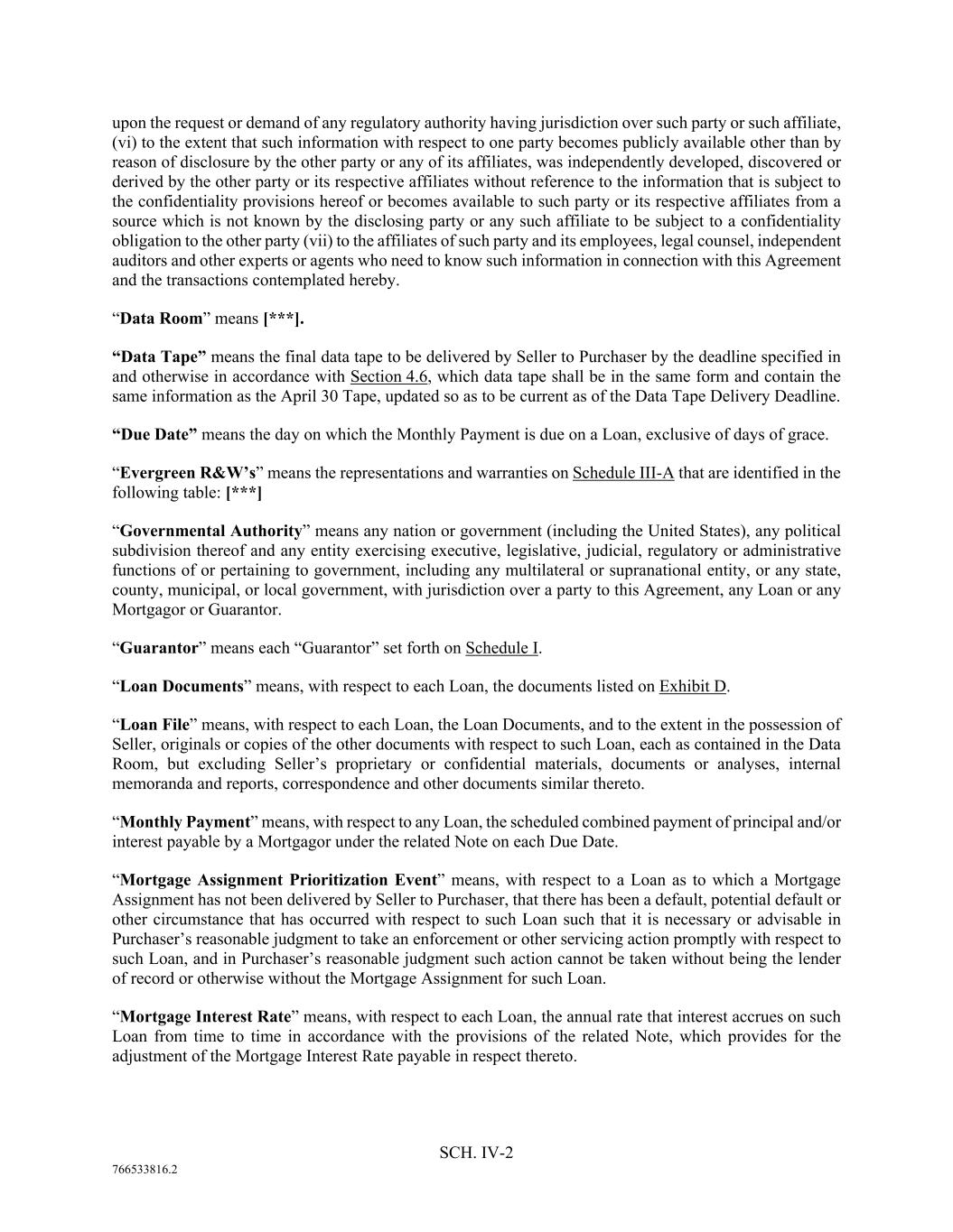 SCH. IV-2 766533816.2 upon the request or demand of any regulatory authority having jurisdiction over such party or such affiliate, (vi) to the extent that such information with respect to one party becomes publicly available other than by reason of disclosure by the other party or any of its affiliates, was independently developed, discovered or derived by the other party or its respective affiliates without reference to the information that is subject to the confidentiality provisions hereof or becomes available to such party or its respective affiliates from a source which is not known by the disclosing party or any such affiliate to be subject to a confidentiality obligation to the other party (vii) to the affiliates of such party and its employees, legal counsel, independent auditors and other experts or agents who need to know such information in connection with this Agreement and the transactions contemplated hereby. “Data Room” means [***]. “Data Tape” means the final data tape to be delivered by Seller to Purchaser by the deadline specified in and otherwise in accordance with Section 4.6, which data tape shall be in the same form and contain the same information as the April 30 Tape, updated so as to be current as of the Data Tape Delivery Deadline. “Due Date” means the day on which the Monthly Payment is due on a Loan, exclusive of days of grace. “Evergreen R&W’s” means the representations and warranties on Schedule III-A that are identified in the following table: [***] “Governmental Authority” means any nation or government (including the United States), any political subdivision thereof and any entity exercising executive, legislative, judicial, regulatory or administrative functions of or pertaining to government, including any multilateral or supranational entity, or any state, county, municipal, or local government, with jurisdiction over a party to this Agreement, any Loan or any Mortgagor or Guarantor. “Guarantor” means each “Guarantor” set forth on Schedule I. “Loan Documents” means, with respect to each Loan, the documents listed on Exhibit D. “Loan File” means, with respect to each Loan, the Loan Documents, and to the extent in the possession of Seller, originals or copies of the other documents with respect to such Loan, each as contained in the Data Room, but excluding Seller’s proprietary or confidential materials, documents or analyses, internal memoranda and reports, correspondence and other documents similar thereto. “Monthly Payment” means, with respect to any Loan, the scheduled combined payment of principal and/or interest payable by a Mortgagor under the related Note on each Due Date. “Mortgage Assignment Prioritization Event” means, with respect to a Loan as to which a Mortgage Assignment has not been delivered by Seller to Purchaser, that there has been a default, potential default or other circumstance that has occurred with respect to such Loan such that it is necessary or advisable in Purchaser’s reasonable judgment to take an enforcement or other servicing action promptly with respect to such Loan, and in Purchaser’s reasonable judgment such action cannot be taken without being the lender of record or otherwise without the Mortgage Assignment for such Loan. “Mortgage Interest Rate” means, with respect to each Loan, the annual rate that interest accrues on such Loan from time to time in accordance with the provisions of the related Note, which provides for the adjustment of the Mortgage Interest Rate payable in respect thereto.