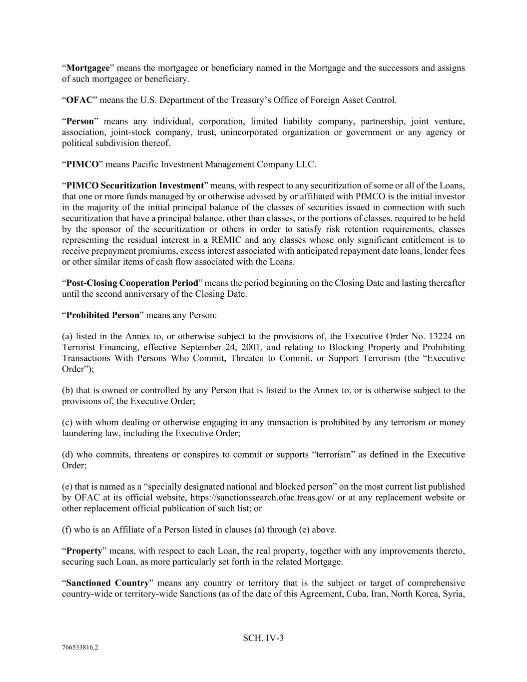 SCH. IV-3 766533816.2 “Mortgagee” means the mortgagee or beneficiary named in the Mortgage and the successors and assigns of such mortgagee or beneficiary. “OFAC” means the U.S. Department of the Treasury’s Office of Foreign Asset Control. “Person” means any individual, corporation, limited liability company, partnership, joint venture, association, joint-stock company, trust, unincorporated organization or government or any agency or political subdivision thereof. “PIMCO” means Pacific Investment Management Company LLC. “PIMCO Securitization Investment” means, with respect to any securitization of some or all of the Loans, that one or more funds managed by or otherwise advised by or affiliated with PIMCO is the initial investor in the majority of the initial principal balance of the classes of securities issued in connection with such securitization that have a principal balance, other than classes, or the portions of classes, required to be held by the sponsor of the securitization or others in order to satisfy risk retention requirements, classes representing the residual interest in a REMIC and any classes whose only significant entitlement is to receive prepayment premiums, excess interest associated with anticipated repayment date loans, lender fees or other similar items of cash flow associated with the Loans. “Post-Closing Cooperation Period” means the period beginning on the Closing Date and lasting thereafter until the second anniversary of the Closing Date. “Prohibited Person” means any Person: (a) listed in the Annex to, or otherwise subject to the provisions of, the Executive Order No. 13224 on Terrorist Financing, effective September 24, 2001, and relating to Blocking Property and Prohibiting Transactions With Persons Who Commit, Threaten to Commit, or Support Terrorism (the “Executive Order”); (b) that is owned or controlled by any Person that is listed to the Annex to, or is otherwise subject to the provisions of, the Executive Order; (c) with whom dealing or otherwise engaging in any transaction is prohibited by any terrorism or money laundering law, including the Executive Order; (d) who commits, threatens or conspires to commit or supports “terrorism” as defined in the Executive Order; (e) that is named as a “specially designated national and blocked person” on the most current list published by OFAC at its official website, https://sanctionssearch.ofac.treas.gov/ or at any replacement website or other replacement official publication of such list; or (f) who is an Affiliate of a Person listed in clauses (a) through (e) above. “Property” means, with respect to each Loan, the real property, together with any improvements thereto, securing such Loan, as more particularly set forth in the related Mortgage. “Sanctioned Country” means any country or territory that is the subject or target of comprehensive country-wide or territory-wide Sanctions (as of the date of this Agreement, Cuba, Iran, North Korea, Syria,