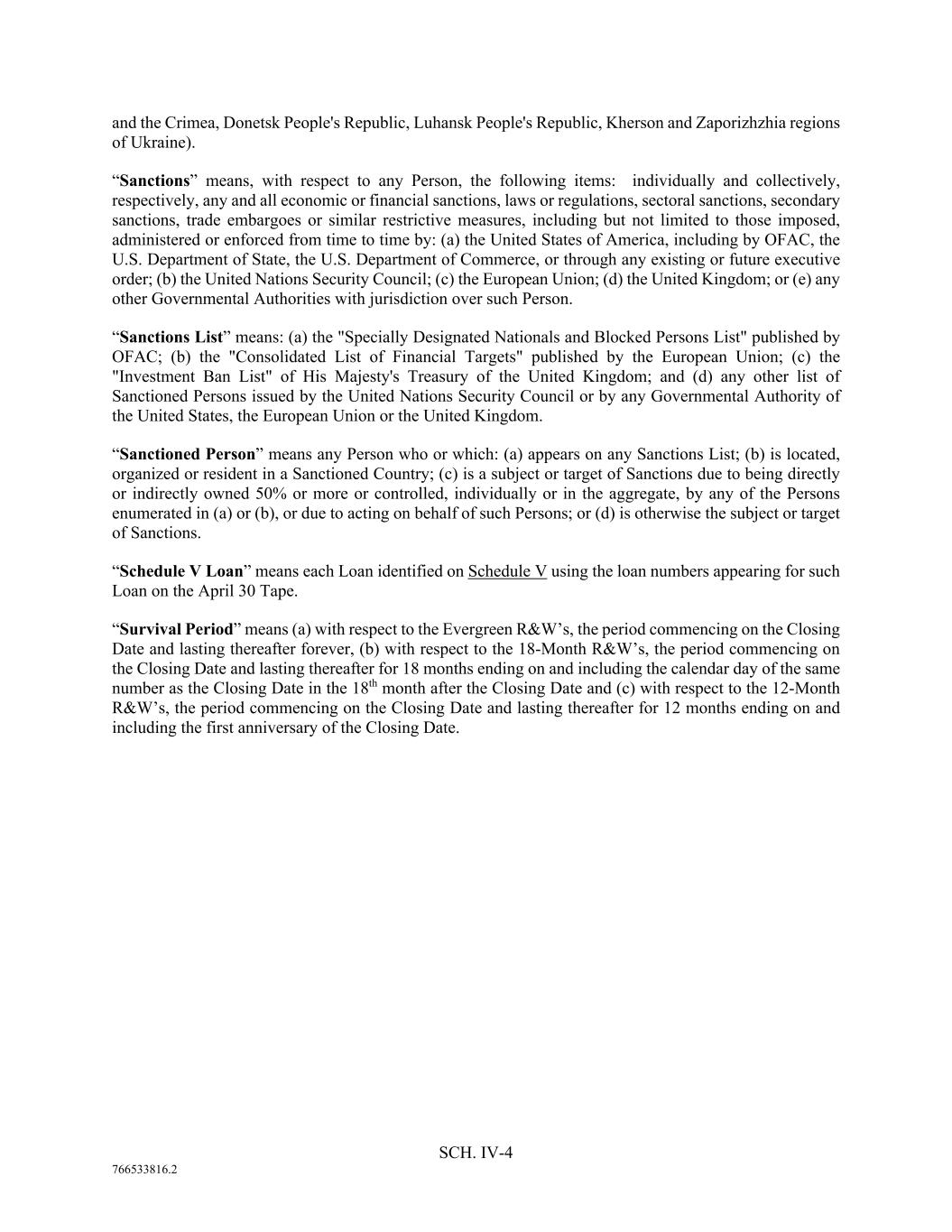 SCH. IV-4 766533816.2 and the Crimea, Donetsk People's Republic, Luhansk People's Republic, Kherson and Zaporizhzhia regions of Ukraine). “Sanctions” means, with respect to any Person, the following items: individually and collectively, respectively, any and all economic or financial sanctions, laws or regulations, sectoral sanctions, secondary sanctions, trade embargoes or similar restrictive measures, including but not limited to those imposed, administered or enforced from time to time by: (a) the United States of America, including by OFAC, the U.S. Department of State, the U.S. Department of Commerce, or through any existing or future executive order; (b) the United Nations Security Council; (c) the European Union; (d) the United Kingdom; or (e) any other Governmental Authorities with jurisdiction over such Person. “Sanctions List” means: (a) the "Specially Designated Nationals and Blocked Persons List" published by OFAC; (b) the "Consolidated List of Financial Targets" published by the European Union; (c) the "Investment Ban List" of His Majesty's Treasury of the United Kingdom; and (d) any other list of Sanctioned Persons issued by the United Nations Security Council or by any Governmental Authority of the United States, the European Union or the United Kingdom. “Sanctioned Person” means any Person who or which: (a) appears on any Sanctions List; (b) is located, organized or resident in a Sanctioned Country; (c) is a subject or target of Sanctions due to being directly or indirectly owned 50% or more or controlled, individually or in the aggregate, by any of the Persons enumerated in (a) or (b), or due to acting on behalf of such Persons; or (d) is otherwise the subject or target of Sanctions. “Schedule V Loan” means each Loan identified on Schedule V using the loan numbers appearing for such Loan on the April 30 Tape. “Survival Period” means (a) with respect to the Evergreen R&W’s, the period commencing on the Closing Date and lasting thereafter forever, (b) with respect to the 18-Month R&W’s, the period commencing on the Closing Date and lasting thereafter for 18 months ending on and including the calendar day of the same number as the Closing Date in the 18th month after the Closing Date and (c) with respect to the 12-Month R&W’s, the period commencing on the Closing Date and lasting thereafter for 12 months ending on and including the first anniversary of the Closing Date.