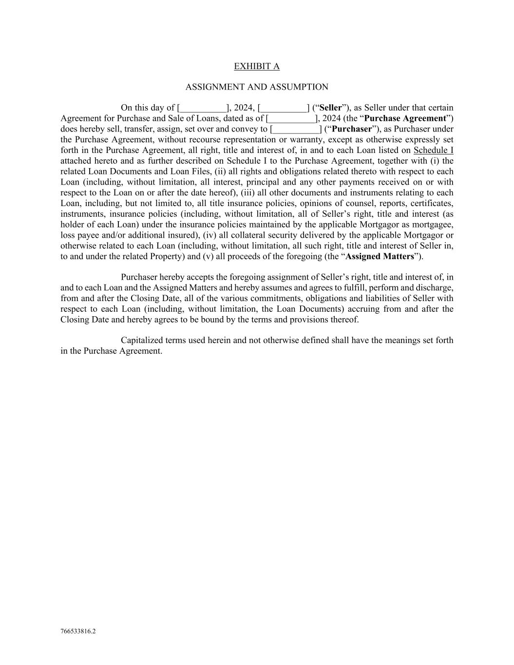 766533816.2 EXHIBIT A ASSIGNMENT AND ASSUMPTION On this day of [__________], 2024, [__________] (“Seller”), as Seller under that certain Agreement for Purchase and Sale of Loans, dated as of [__________], 2024 (the “Purchase Agreement”) does hereby sell, transfer, assign, set over and convey to [__________] (“Purchaser”), as Purchaser under the Purchase Agreement, without recourse representation or warranty, except as otherwise expressly set forth in the Purchase Agreement, all right, title and interest of, in and to each Loan listed on Schedule I attached hereto and as further described on Schedule I to the Purchase Agreement, together with (i) the related Loan Documents and Loan Files, (ii) all rights and obligations related thereto with respect to each Loan (including, without limitation, all interest, principal and any other payments received on or with respect to the Loan on or after the date hereof), (iii) all other documents and instruments relating to each Loan, including, but not limited to, all title insurance policies, opinions of counsel, reports, certificates, instruments, insurance policies (including, without limitation, all of Seller’s right, title and interest (as holder of each Loan) under the insurance policies maintained by the applicable Mortgagor as mortgagee, loss payee and/or additional insured), (iv) all collateral security delivered by the applicable Mortgagor or otherwise related to each Loan (including, without limitation, all such right, title and interest of Seller in, to and under the related Property) and (v) all proceeds of the foregoing (the “Assigned Matters”). Purchaser hereby accepts the foregoing assignment of Seller’s right, title and interest of, in and to each Loan and the Assigned Matters and hereby assumes and agrees to fulfill, perform and discharge, from and after the Closing Date, all of the various commitments, obligations and liabilities of Seller with respect to each Loan (including, without limitation, the Loan Documents) accruing from and after the Closing Date and hereby agrees to be bound by the terms and provisions thereof. Capitalized terms used herein and not otherwise defined shall have the meanings set forth in the Purchase Agreement.