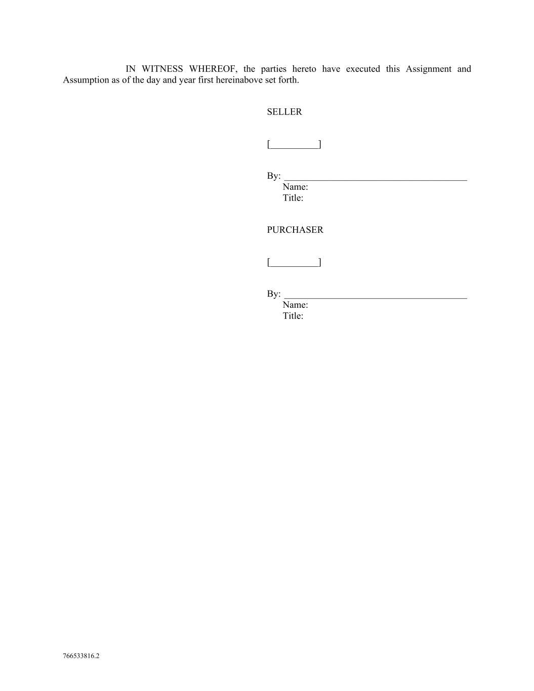 766533816.2 IN WITNESS WHEREOF, the parties hereto have executed this Assignment and Assumption as of the day and year first hereinabove set forth. SELLER [__________] By: ______________________________________ Name: Title: PURCHASER [__________] By: ______________________________________ Name: Title: