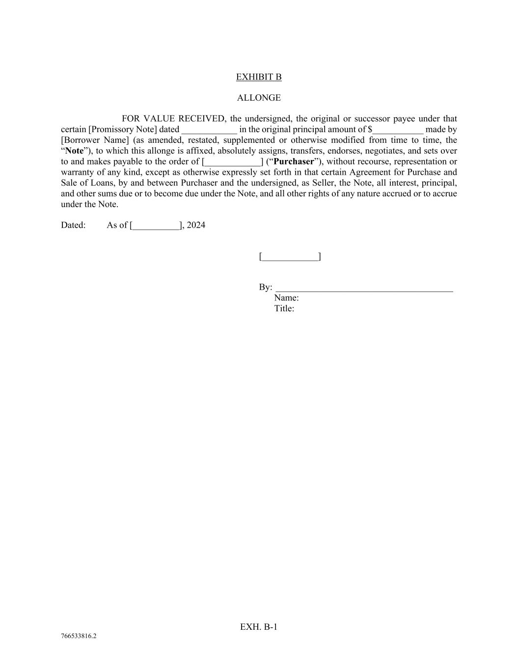 EXH. B-1 766533816.2 EXHIBIT B ALLONGE FOR VALUE RECEIVED, the undersigned, the original or successor payee under that certain [Promissory Note] dated ____________ in the original principal amount of $___________ made by [Borrower Name] (as amended, restated, supplemented or otherwise modified from time to time, the “Note”), to which this allonge is affixed, absolutely assigns, transfers, endorses, negotiates, and sets over to and makes payable to the order of [____________] (“Purchaser”), without recourse, representation or warranty of any kind, except as otherwise expressly set forth in that certain Agreement for Purchase and Sale of Loans, by and between Purchaser and the undersigned, as Seller, the Note, all interest, principal, and other sums due or to become due under the Note, and all other rights of any nature accrued or to accrue under the Note. Dated: As of [__________], 2024 [____________] By: ______________________________________ Name: Title: