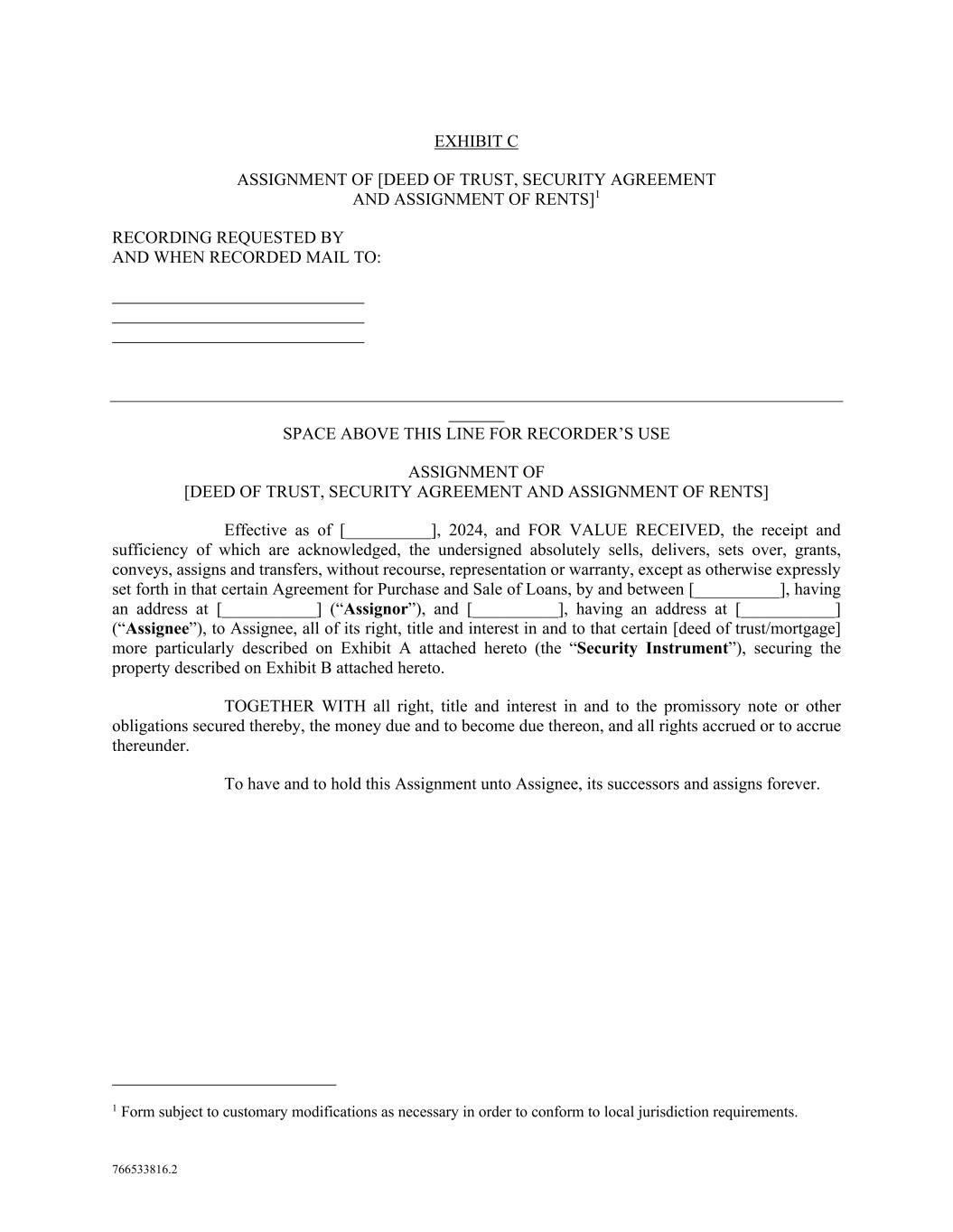 766533816.2 EXHIBIT C ASSIGNMENT OF [DEED OF TRUST, SECURITY AGREEMENT AND ASSIGNMENT OF RENTS]1 RECORDING REQUESTED BY AND WHEN RECORDED MAIL TO: SPACE ABOVE THIS LINE FOR RECORDER’S USE ASSIGNMENT OF [DEED OF TRUST, SECURITY AGREEMENT AND ASSIGNMENT OF RENTS] Effective as of [__________], 2024, and FOR VALUE RECEIVED, the receipt and sufficiency of which are acknowledged, the undersigned absolutely sells, delivers, sets over, grants, conveys, assigns and transfers, without recourse, representation or warranty, except as otherwise expressly set forth in that certain Agreement for Purchase and Sale of Loans, by and between [__________], having an address at [___________] (“Assignor”), and [__________], having an address at [___________] (“Assignee”), to Assignee, all of its right, title and interest in and to that certain [deed of trust/mortgage] more particularly described on Exhibit A attached hereto (the “Security Instrument”), securing the property described on Exhibit B attached hereto. TOGETHER WITH all right, title and interest in and to the promissory note or other obligations secured thereby, the money due and to become due thereon, and all rights accrued or to accrue thereunder. To have and to hold this Assignment unto Assignee, its successors and assigns forever. 1 Form subject to customary modifications as necessary in order to conform to local jurisdiction requirements.